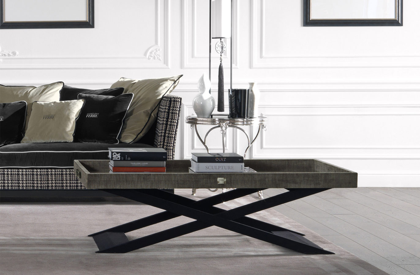 带托盘的中央桌子。底座采用山毛榉木制成,覆盖着黑色超细纤维。2 个皮革手柄。托盘在多层杨树覆盖织物猫。C |L.14.01