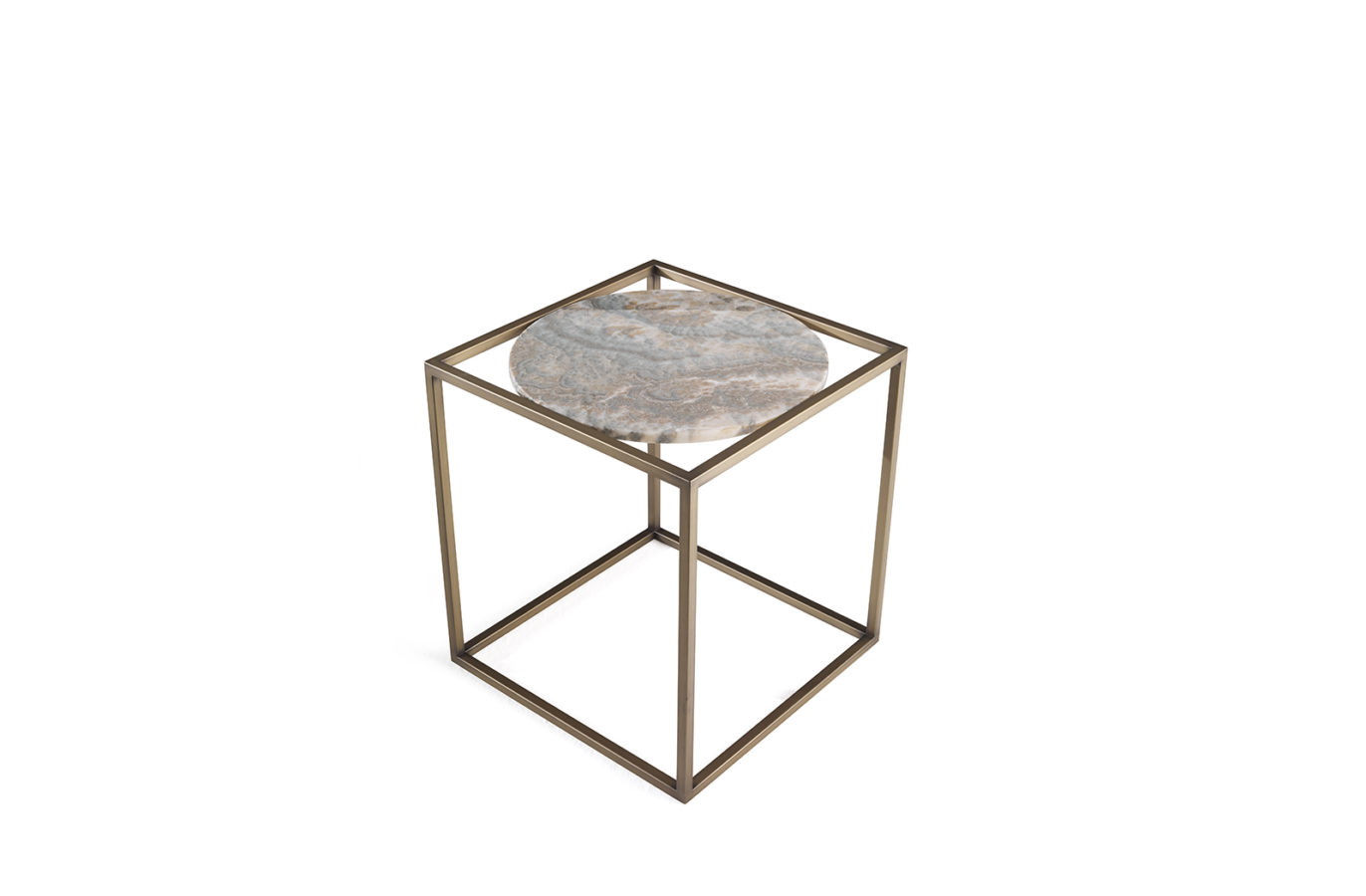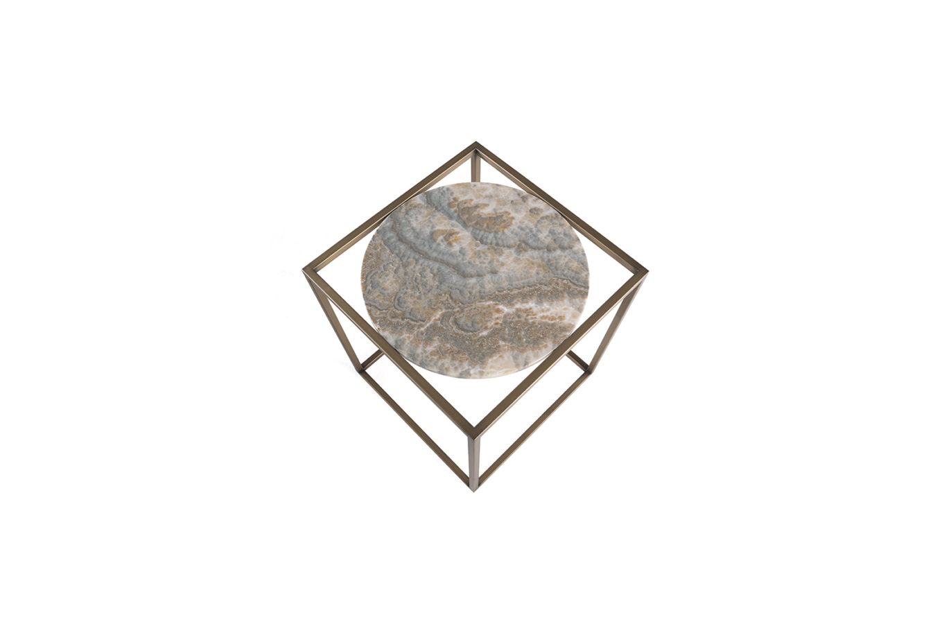 由几何形状和不同材料组成的桌子结合了矩形结构的复古魅力和古铜色饰面,以及灰色玛瑙圆顶的珍贵和永恒的吸引力。边桌,金属结构,古铜色饰面。顶部在灰色浑浊的缟玛瑙。