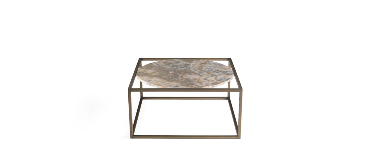 由几何形状和不同材料组成的桌子结合了矩形结构的复古魅力和古铜色饰面,以及灰色玛瑙圆顶的珍贵和永恒的吸引力。中央工作台,金属结构,古铜色饰面。顶部在灰色浑浊的缟玛瑙。