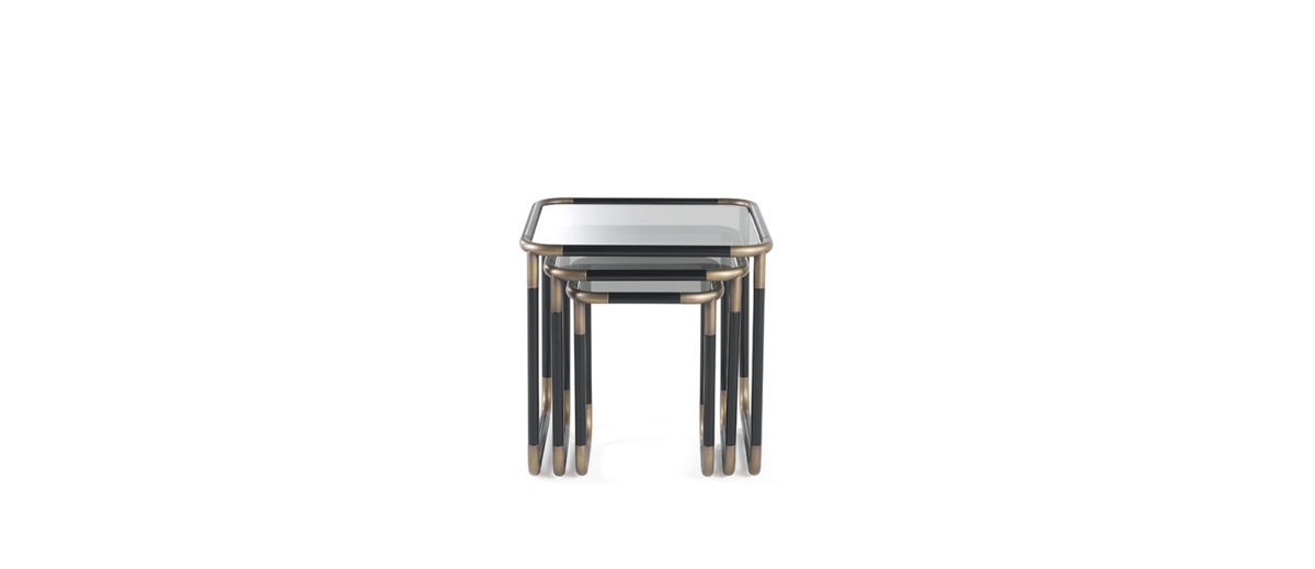 Pigneto咖啡桌由不同尺寸的元素组成,带有烟熏玻璃顶部和金属结构,富含古铜色饰面的元素。边桌采用金属结构,金属接头,饰有青铜饰面。烟熏玻璃顶部。