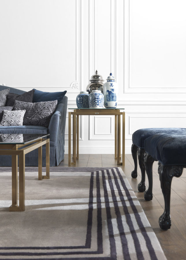 边桌,金属结构,古铜色饰面。耦合玻璃顶部(超透明+烟熏)。