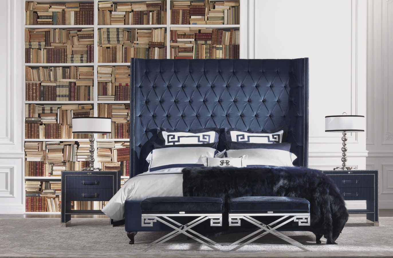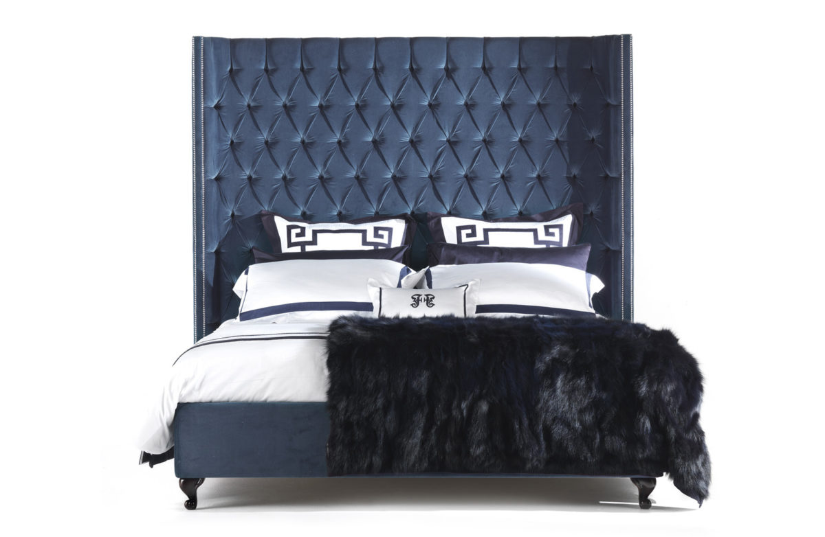 邦德床重要而珍贵,其特点是细节的精致。一个重要而令人印象深刻的床头板,带有精致的卡皮托尼饰面,沿着外周延伸的铆钉,路易十五风格的脚。全部由Gianfranco Ferré家居饰品系列的亚麻和靠垫完成。结构采用多层杨木、山毛榉木和泡沫。皮革猫的内饰。|L.14.13. 黑漆处理的支腿。装饰性金属钉头。