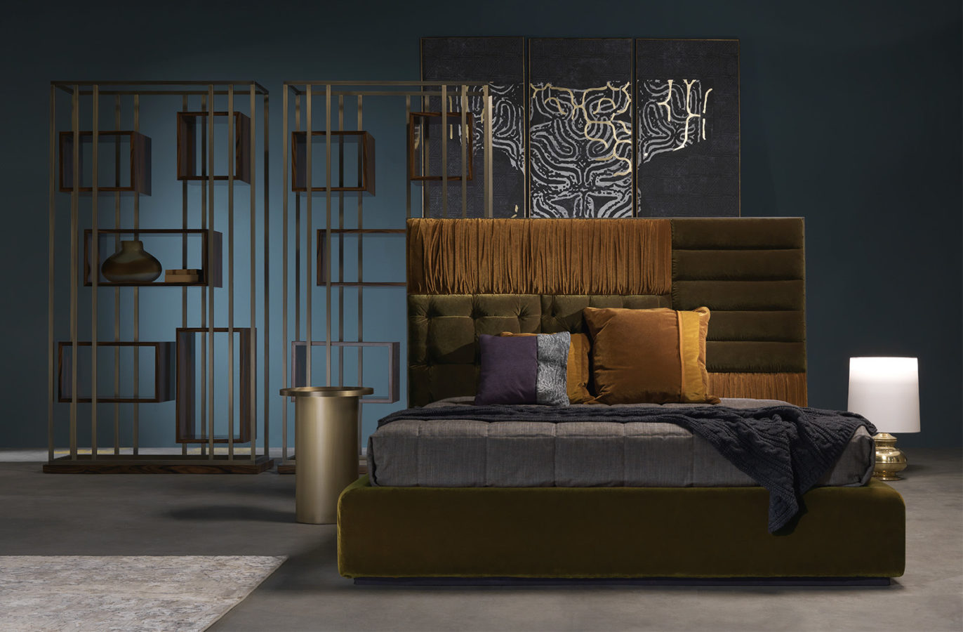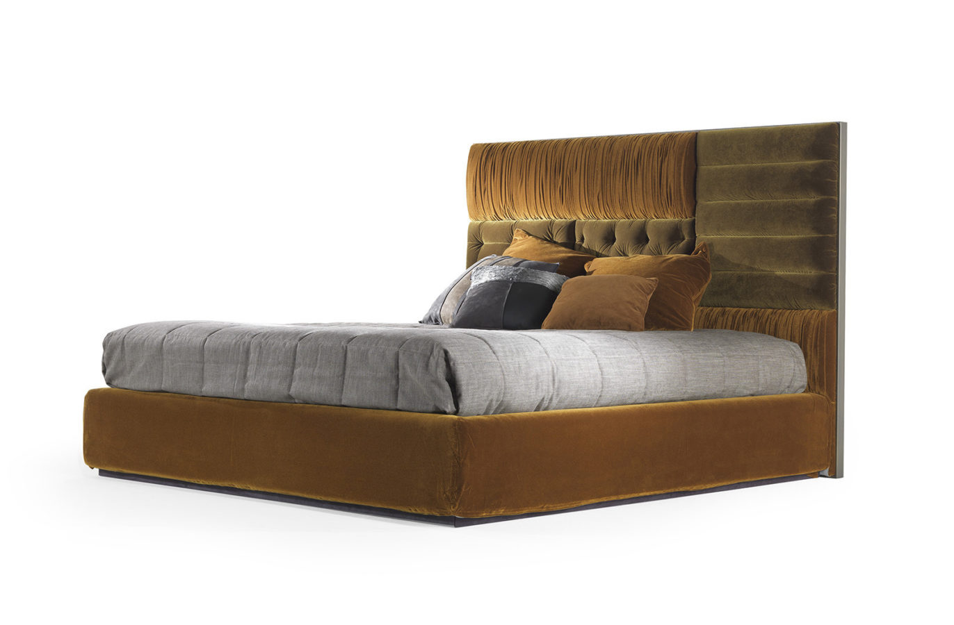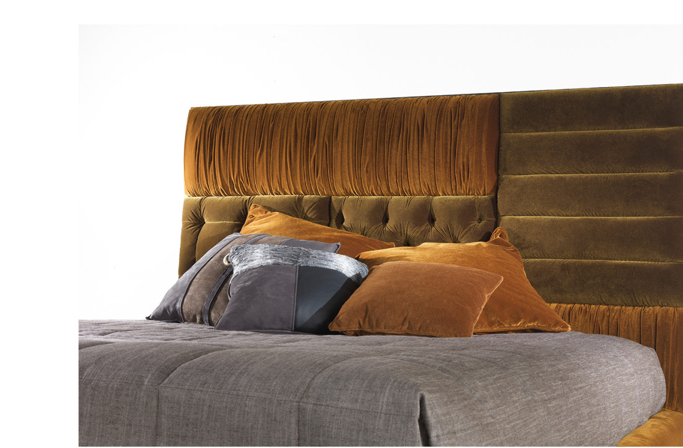 一张具有大胆个性的优雅床,床头板具有不同的内饰,从capitonné到绗缝和褶皱的木板,以及两种不同类型的色调在色调天鹅绒上的结合。选择和定制不同街区的内饰和面料的可能性可以满足客户最多样化的口味。结构采用山毛榉木和泡沫,框架采用古铜色金属饰面。织物猫的内饰。B |L.18.50和猫。B |L.18.55.