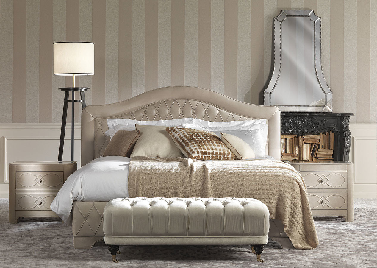 双人床配有精致的精裁。这款表款将床头板的蜿蜒线条与底座的几何形状相结合,以 Capitonné 饰面的永恒优雅丰富了整个环境。山毛榉木和泡沫结构。皮革猫的内饰。B |L.08.01.