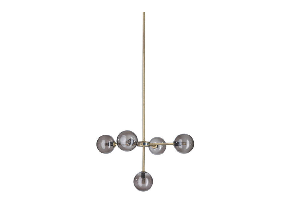 5灯吊灯,黄铜结构。青铜饰面。模制玻璃灯罩。