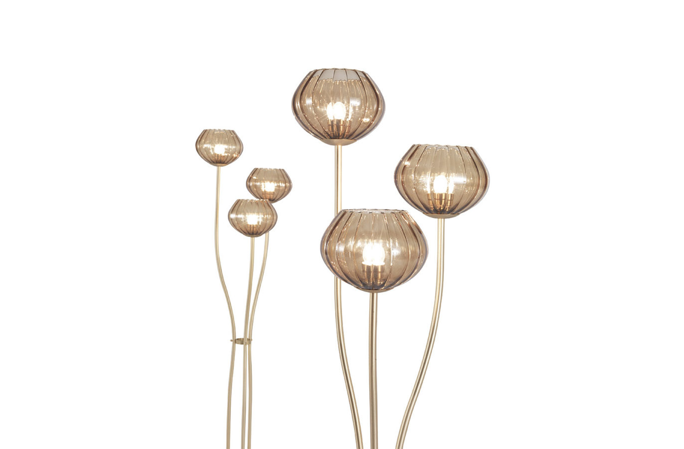 金属结构落地灯。哑光黄铜饰面,玻璃灯罩。