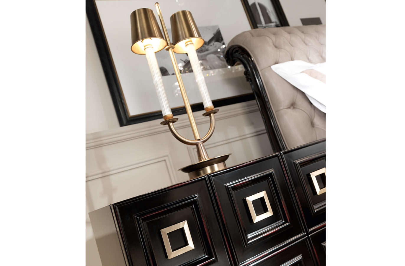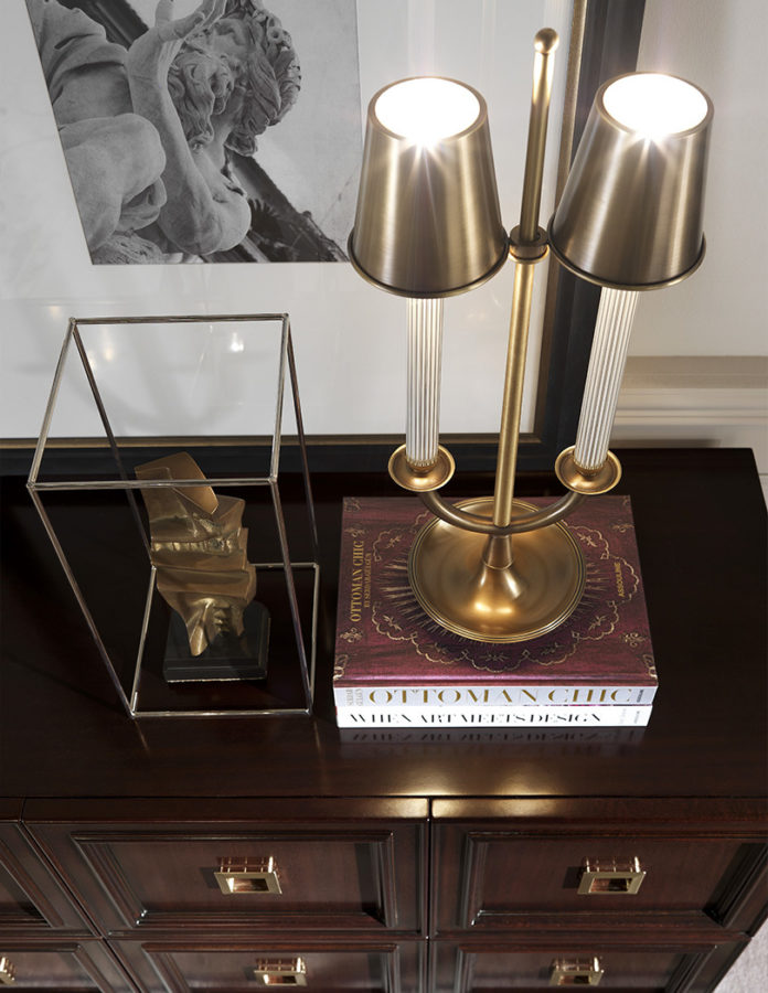黄铜和玻璃元素的组合,打造出具有复古魅力的经典灯具。台灯,结构采用黄铜和玻璃细节。青铜饰面。