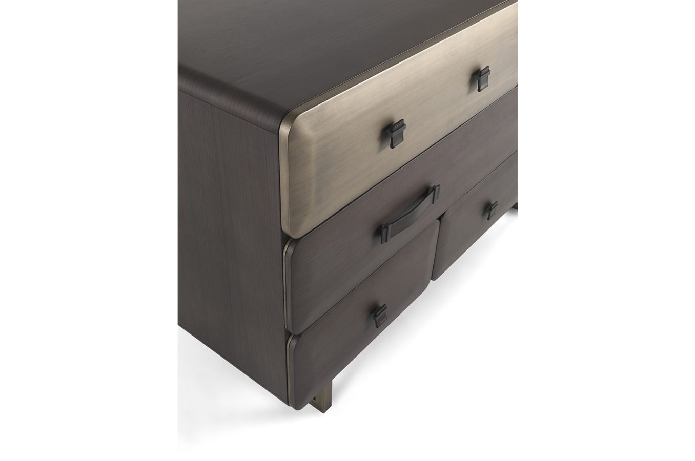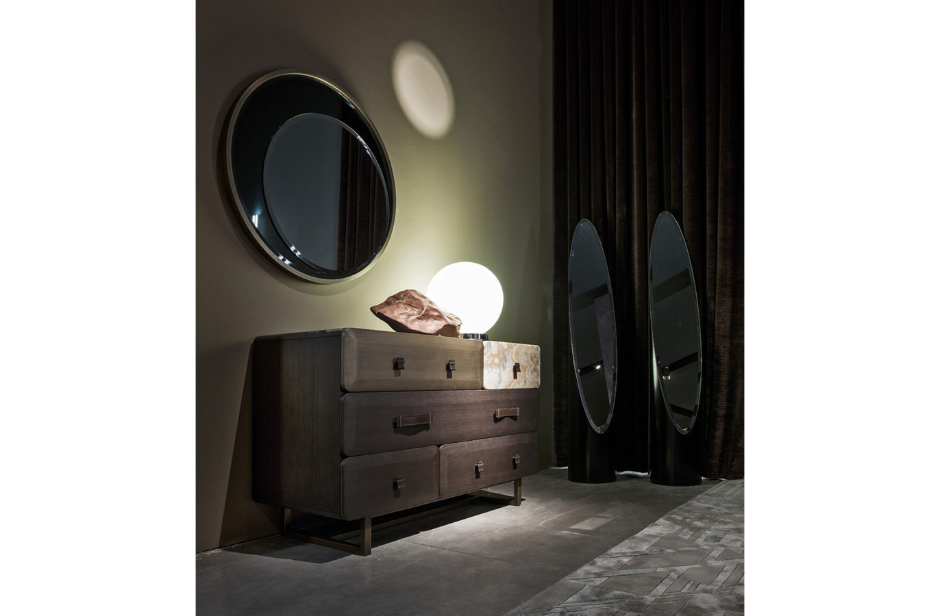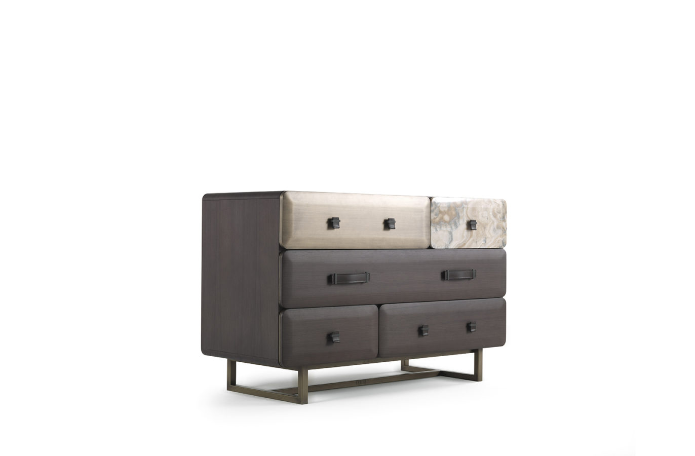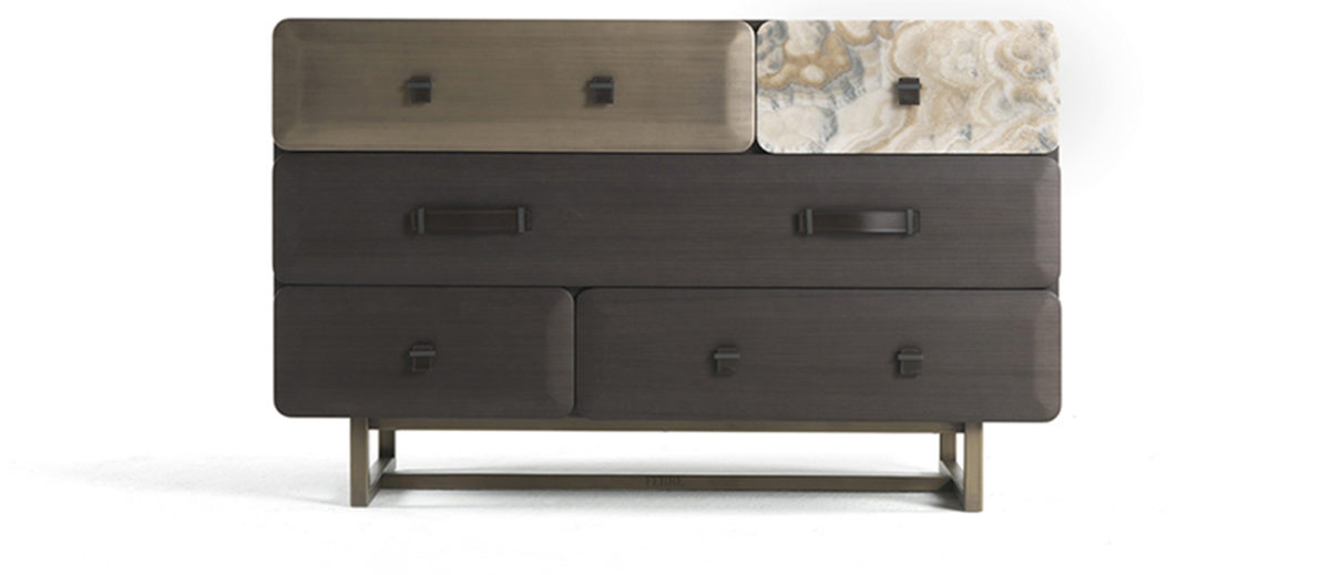 精美的大理石,珍贵的木材和明亮的金属饰面。由不同材料组成的特殊组合,具有大都市和非常规魅力的家具。抽屉柜,结构采用泰木色调的烟灰色。前抽屉和弧形门采用泰木/灰色浑浊缟玛瑙/木材制成,饰有古铜色饰面。内部结构和搁板覆盖着黑色超细纤维。底座采用金属制成,饰有古铜色饰面。黑色金属和棕色皮革手柄。