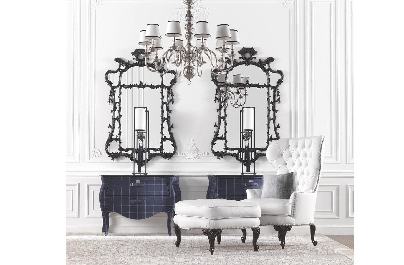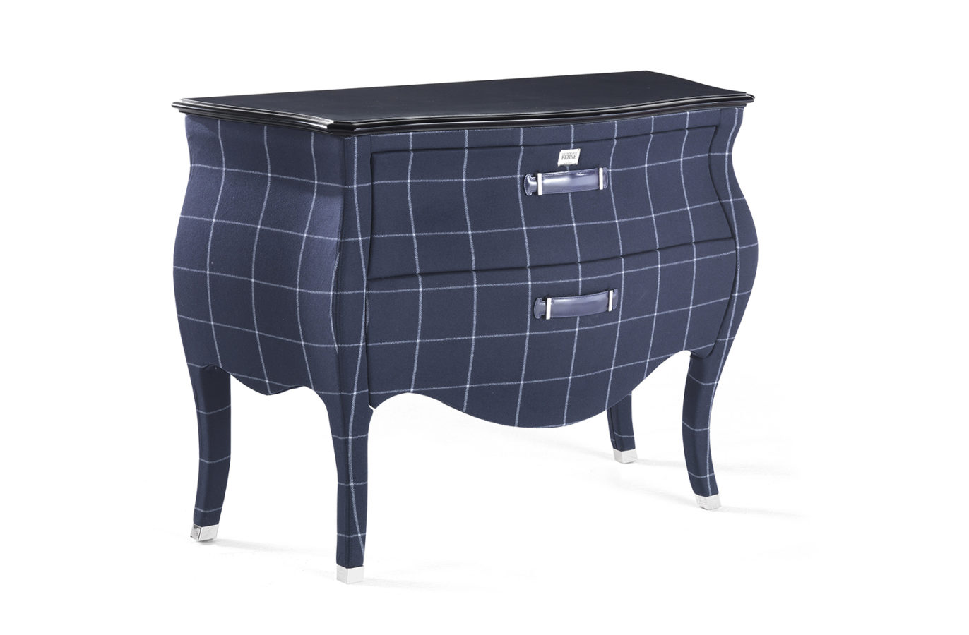 多层杨木结构的抽屉柜。外面覆盖着织物猫。C |L.14.11. 内侧覆盖有超细纤维。黑色漆面的木制顶部。皮革手柄,金属腿帽。