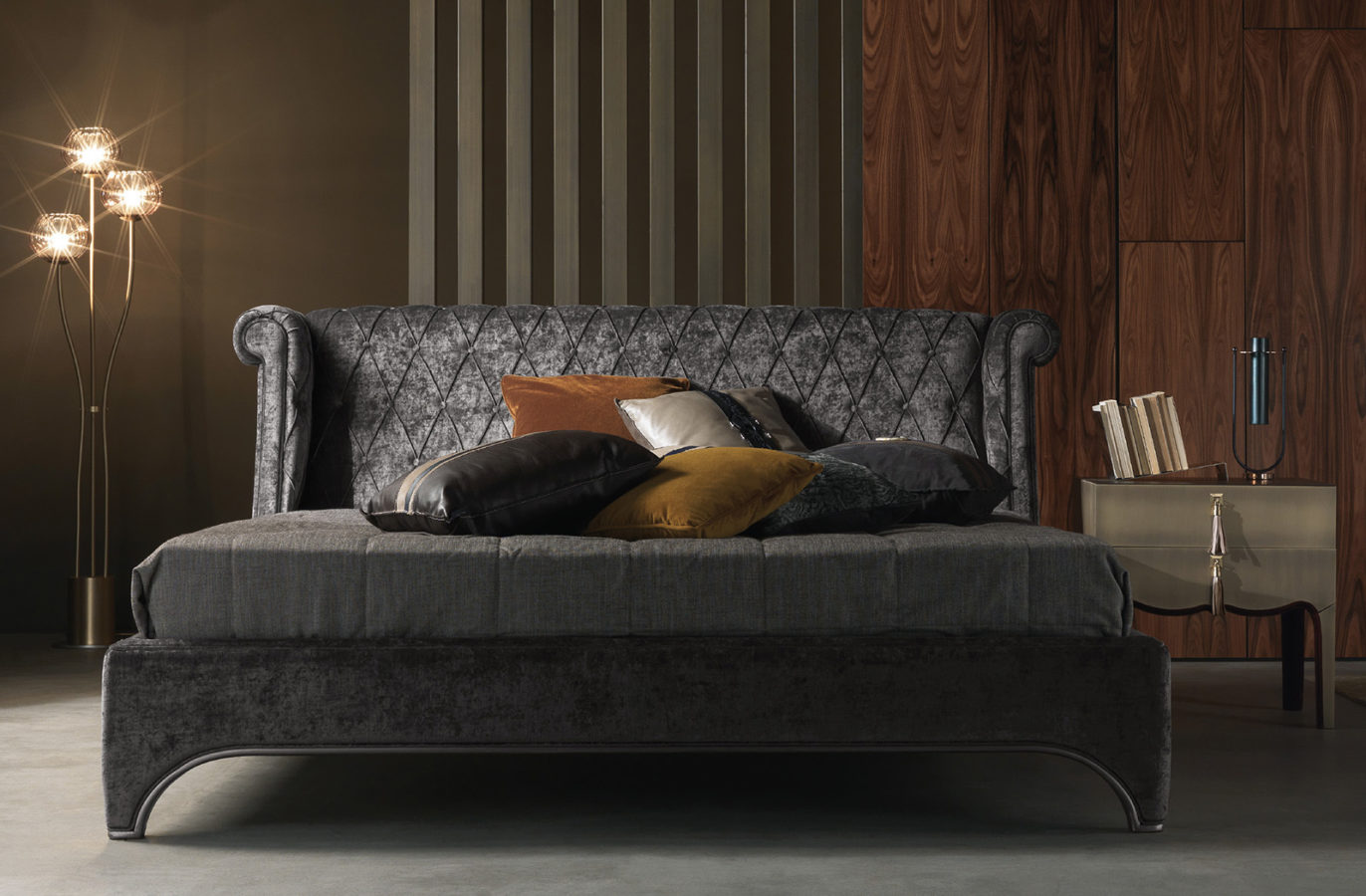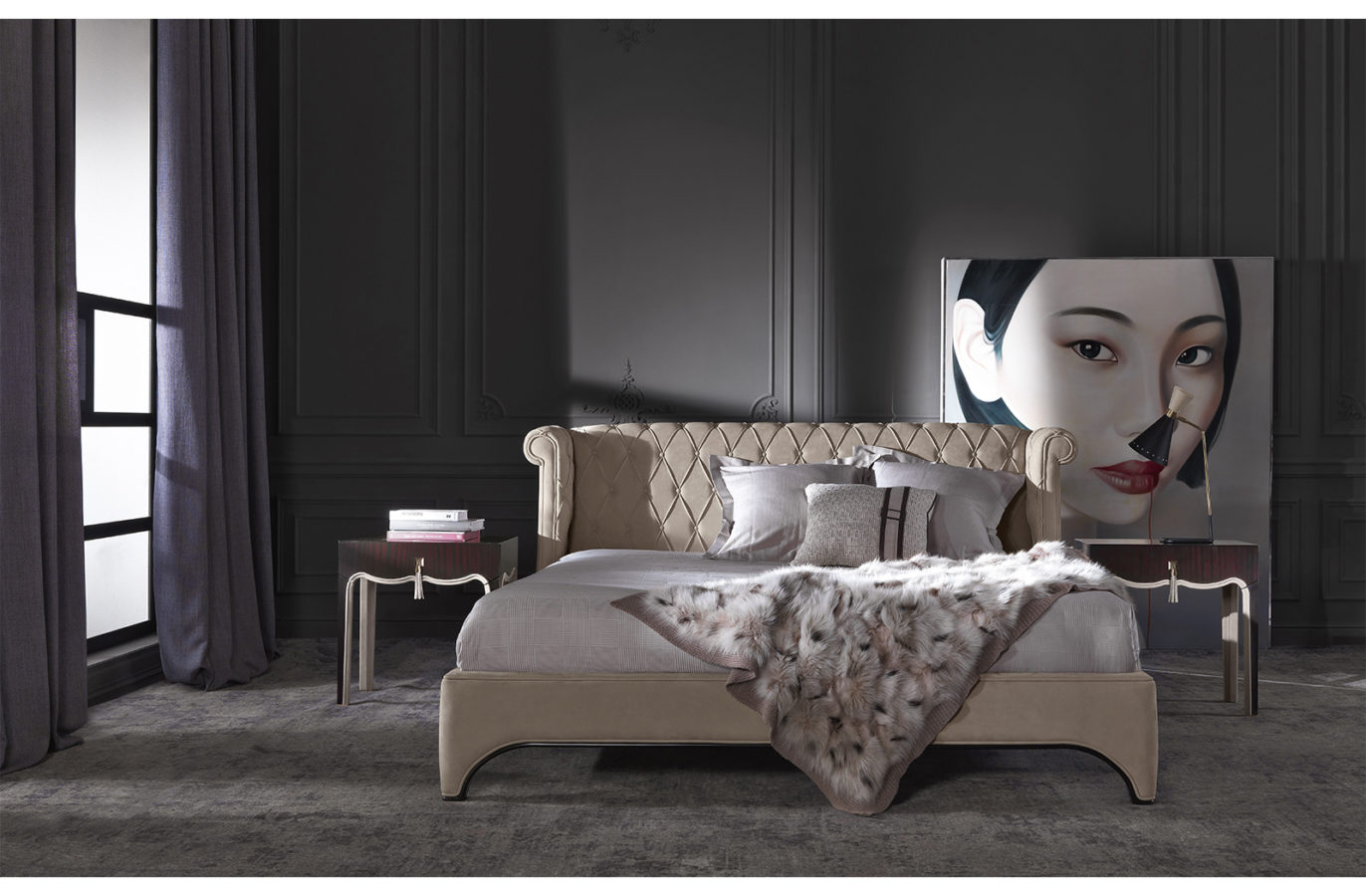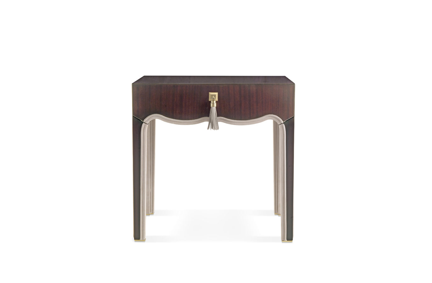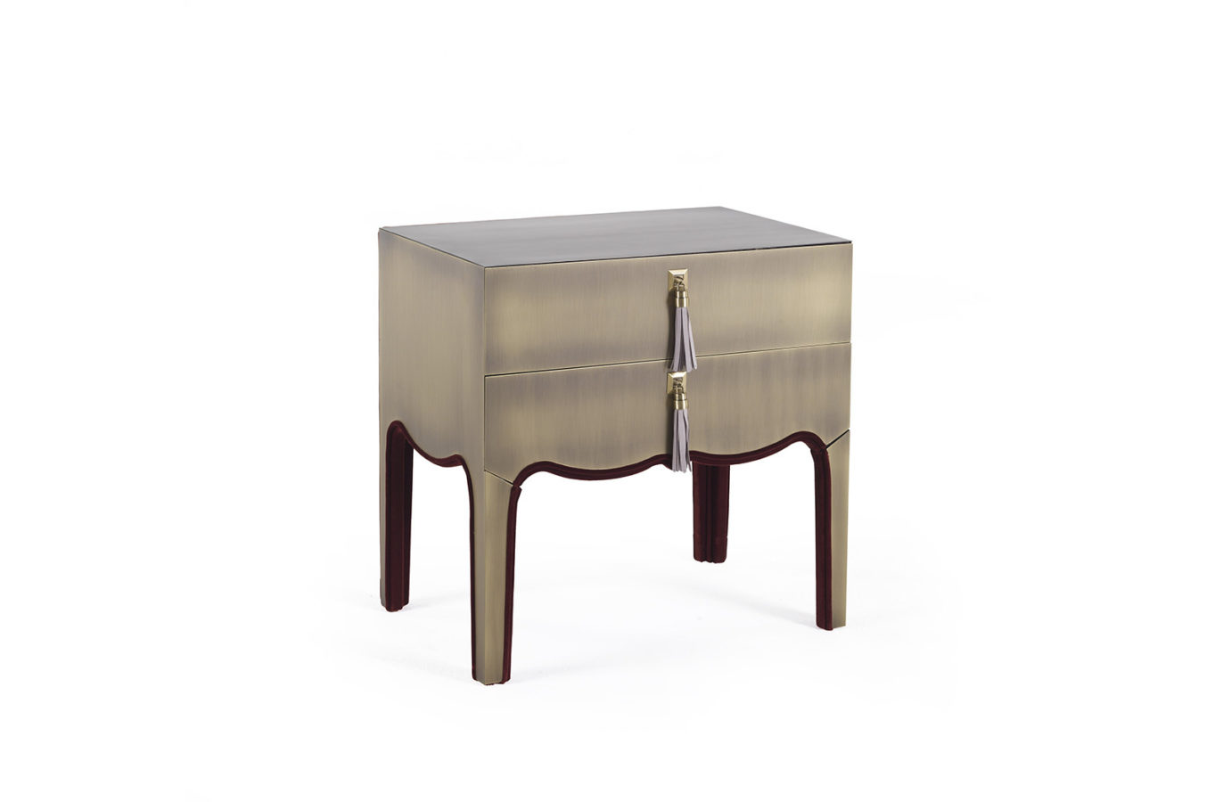 皇家床头柜完美地融合了传统与现代,不仅扮演着简单的支撑家具的作用,而且还将自己变成了一件能够增强卧室魅力的装饰品。45°组件强调的蜿蜒形状,桃花心木饰面,织物或皮革滚边以及唤起古典风格的优雅流苏是这款床头柜的特征,突出了其精致的个性。床头柜采用多层杨木结构,金属覆盖,古铜色饰面,织物猫细节。B |L.18.44. 金属和皮革猫手柄。B |L.08.01.