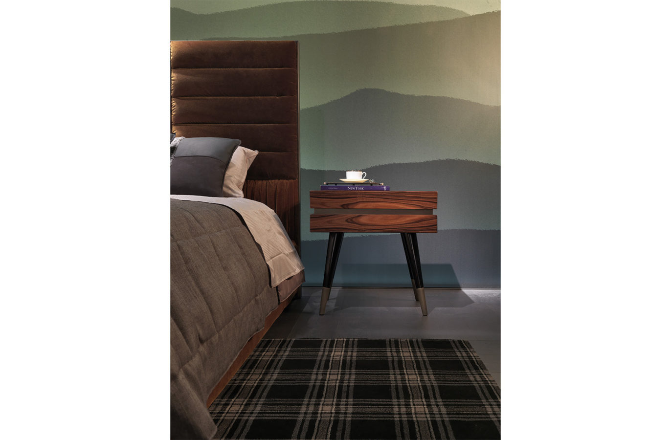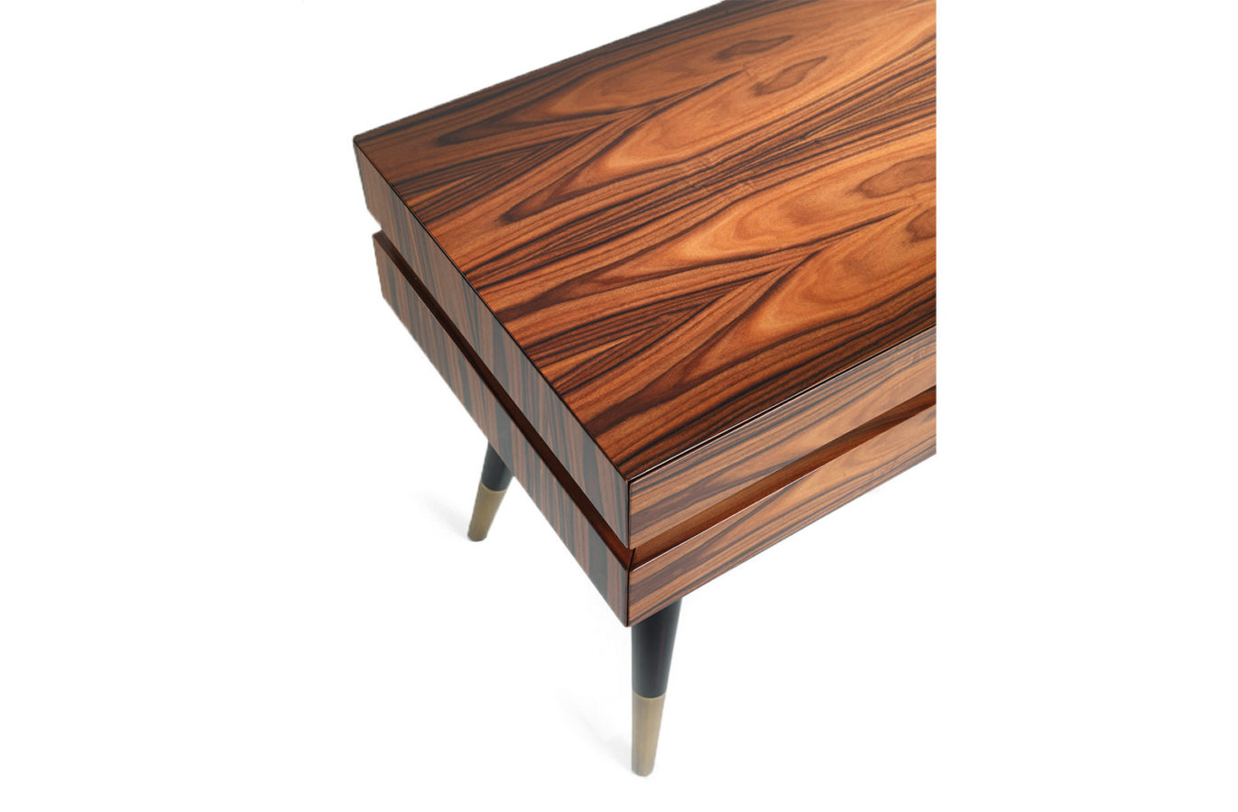 Sean 床头柜以 45° 的弧度组装,红木贴面可围绕整个橱柜旋转,给人一种连续性感,其特点是斜腿、黄铜尖端和带古铜色黄铜带的无把手抽屉。复古、温暖和天然材料的组合,营造出优雅舒适的卧室。床头柜采用山毛榉木结构,红木装饰,表面光亮。腿在黑色漆面饰面。古铜色木材细节。