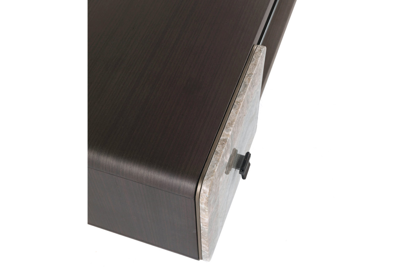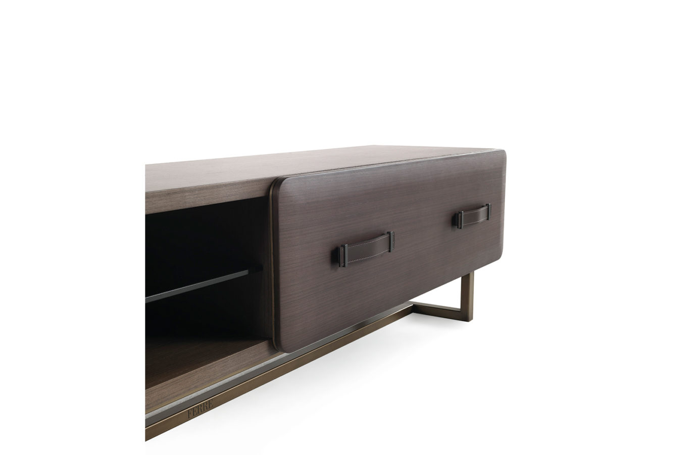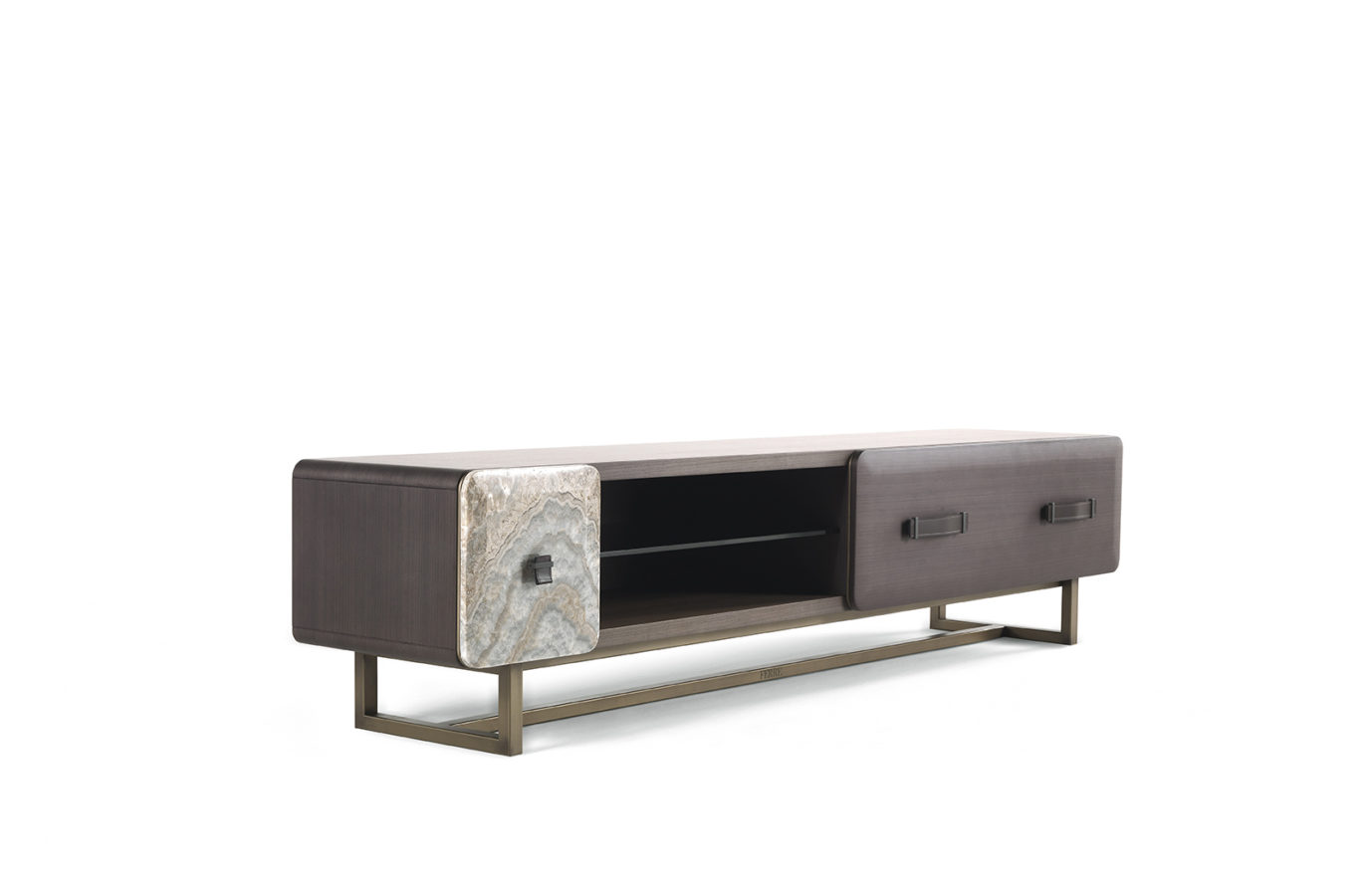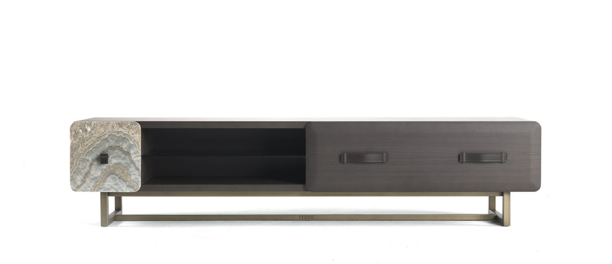精美的大理石,珍贵的木材和明亮的金属饰面。由不同材料组成的特殊组合,具有大都市和非常规魅力的家具。电视架,采用泰木结构,烟灰色。泰木/灰色浑浊缟玛瑙前抽屉。内部结构和搁板覆盖着黑色超细纤维。底座采用金属制成,饰有古铜色饰面。黑色金属和棕色皮革手柄。