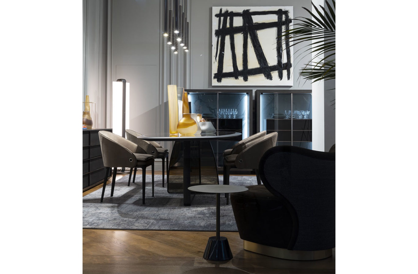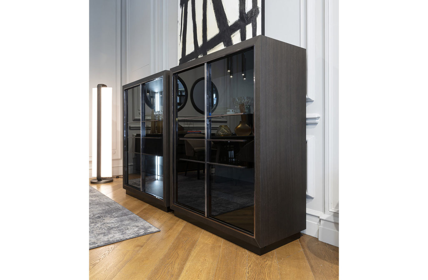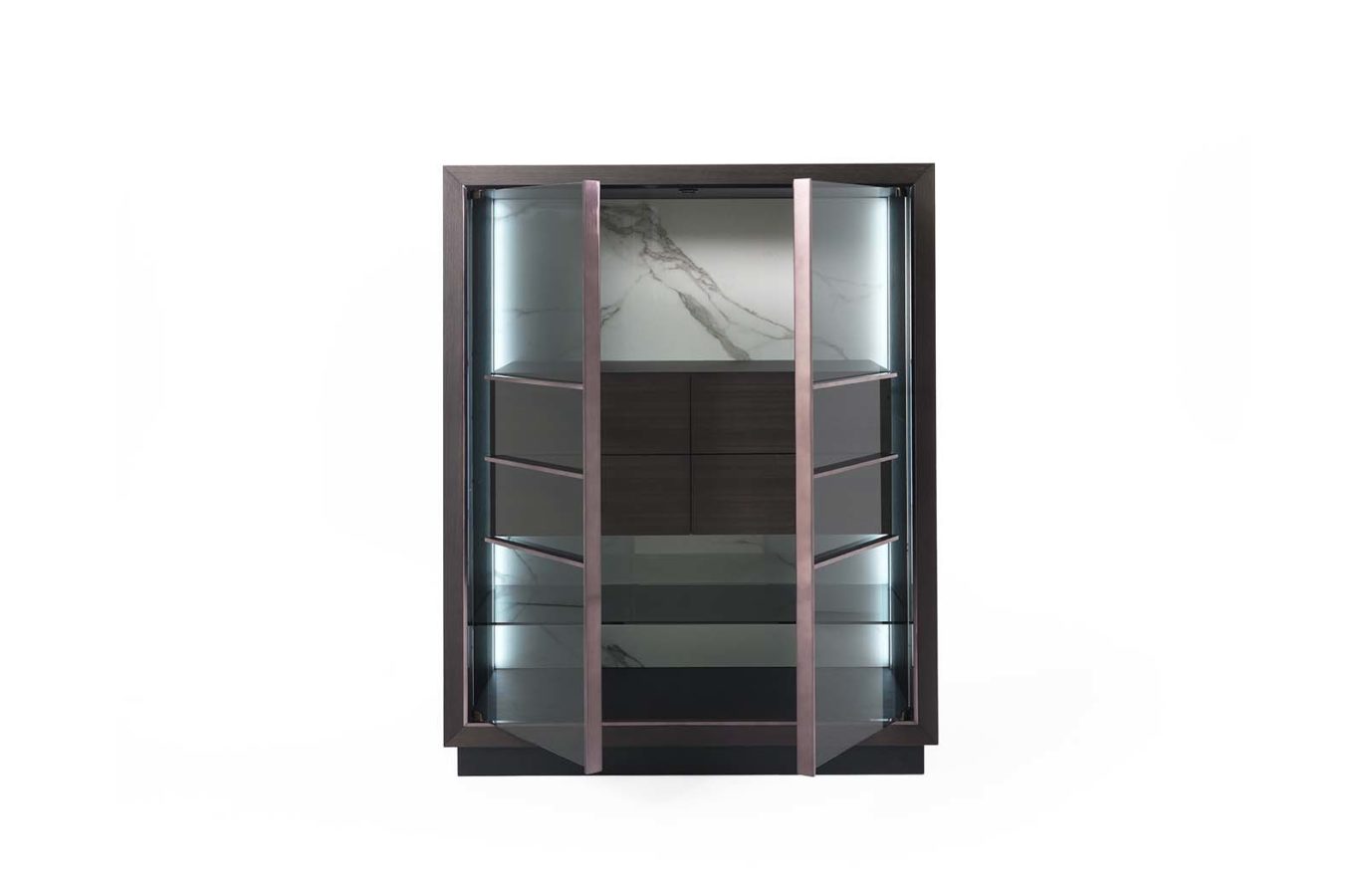 该机柜通过结合美学和功能来完成新奥尔良系列。它的特点是带有Calacatta设计的格雷斯瓷背,搭配烟熏玻璃,它配备了一种技术,只需接近底座即可打开插入陈列柜中的LED,从而实现亲密而精致的照明。机柜采用Tay贴面多层木材染色烟灰色结构,以45°组装,黑色铬漆钢25x10mm管状嵌件,带可伸缩手柄和销钉。底座采用哑光黑漆多层木材。车门采用8毫米厚的烟熏钢化玻璃,带黑色镀铬清漆电焊钢把手。靠背采用多层木材,内部覆盖物采用卡拉卡塔最大瓷釉,外部覆盖物采用黑色超细纤维。内部照明系统通过位于底座左侧的运动传感器激活,控制自然LED照明的打开。