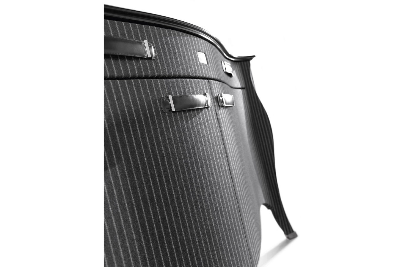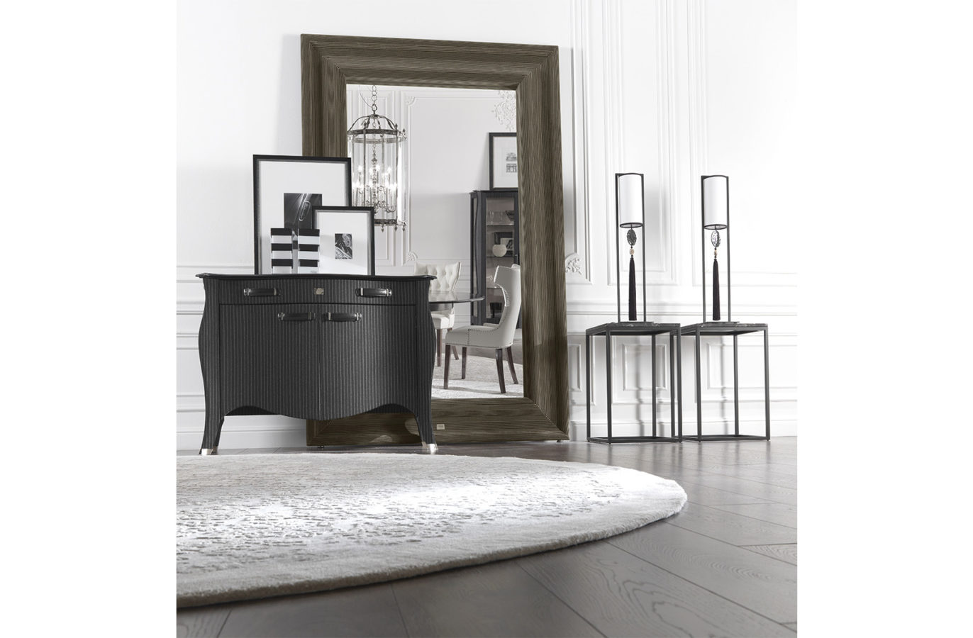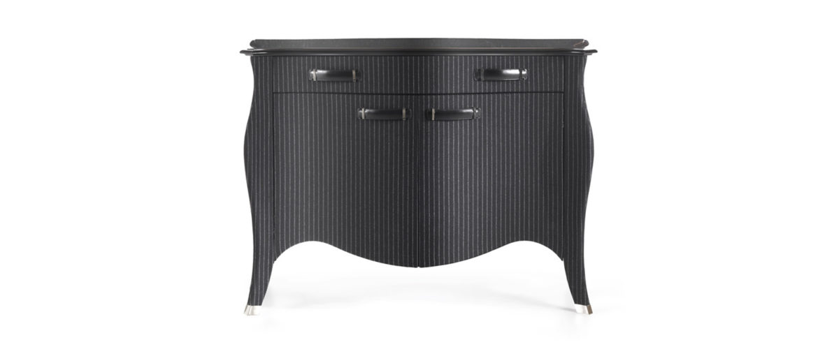 多层杨木结构餐具柜。外面覆盖着织物猫。C |L.14.04. 内部覆盖着超细纤维。黑色漆面的木制顶部。皮革手柄,金属腿帽。