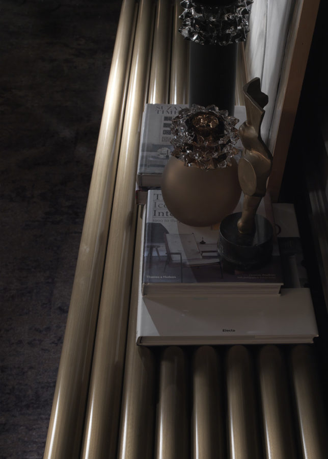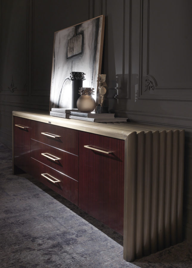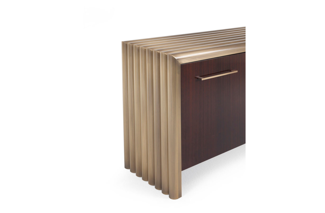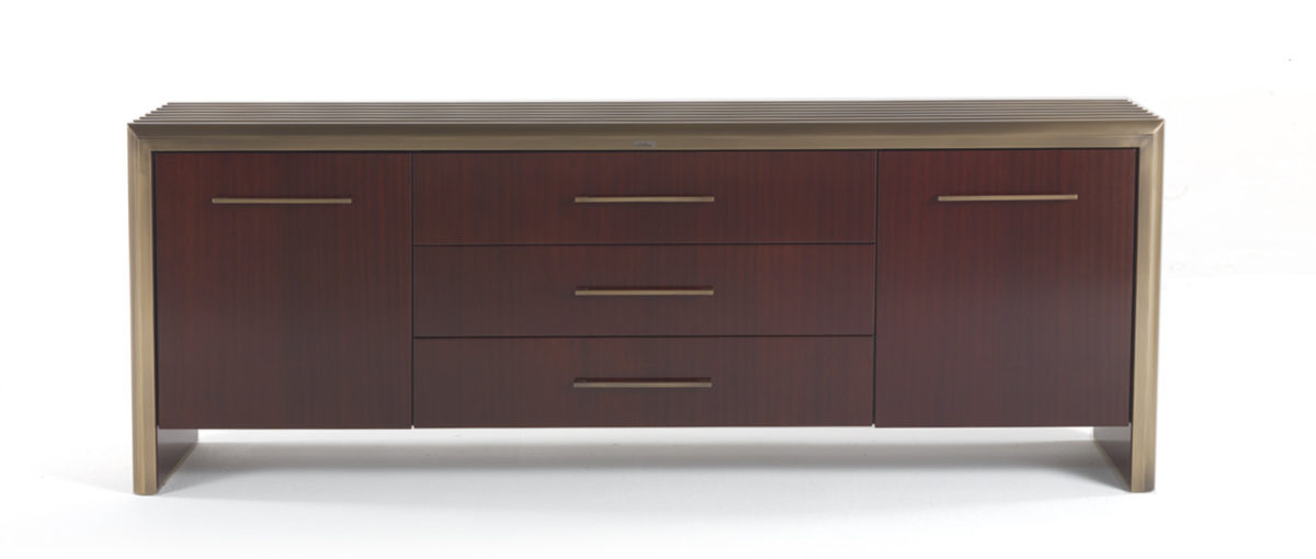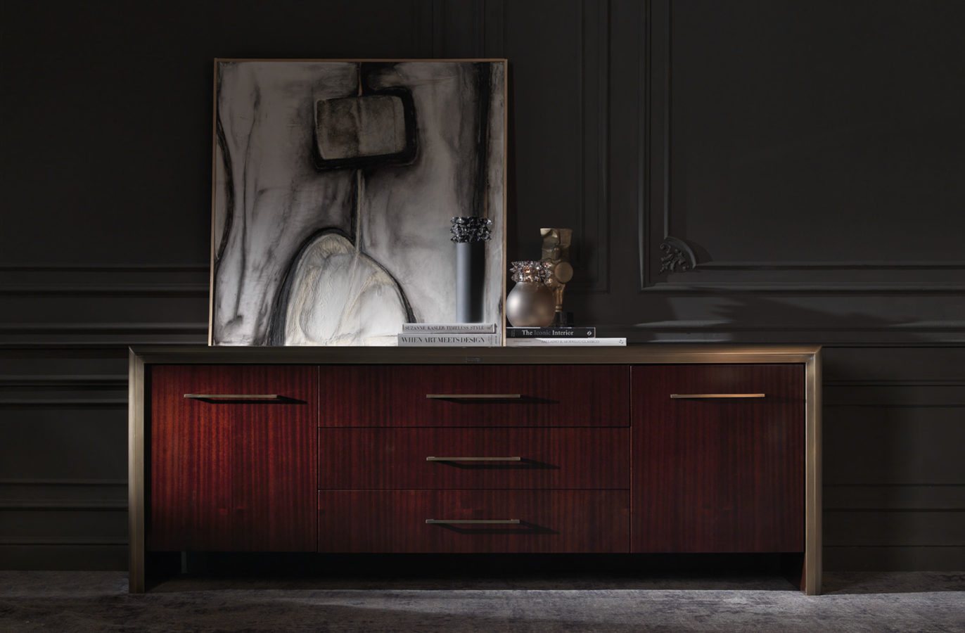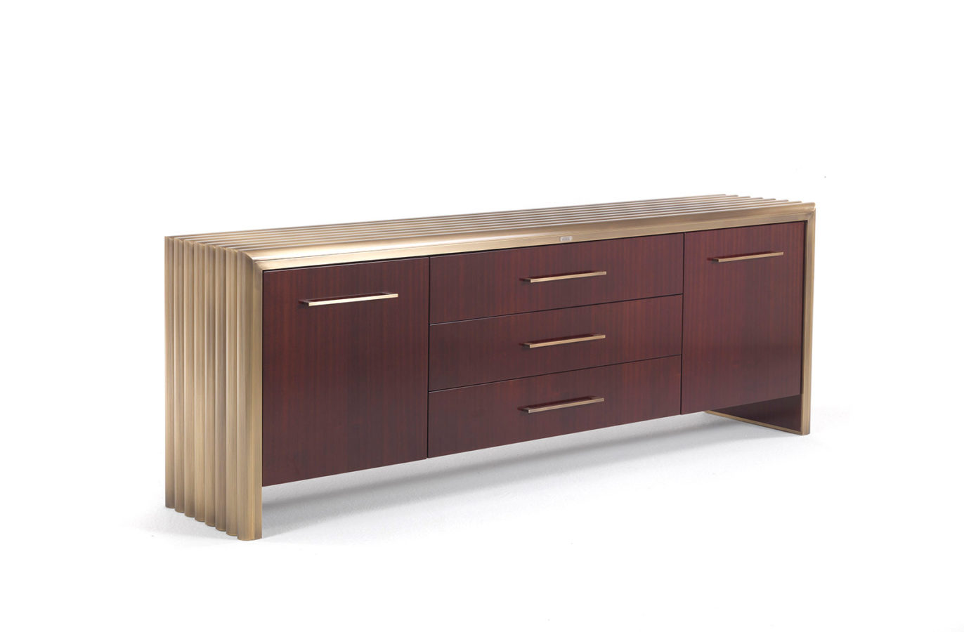 精致的做工和优雅、奢华的细节是这款重要餐具柜的主要特征,适合任何风格和环境。餐具柜采用山毛榉木和金属结构。桃花心木和古铜色饰面。
