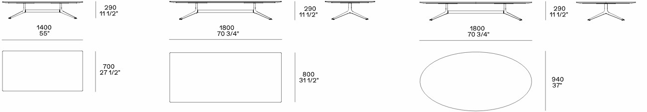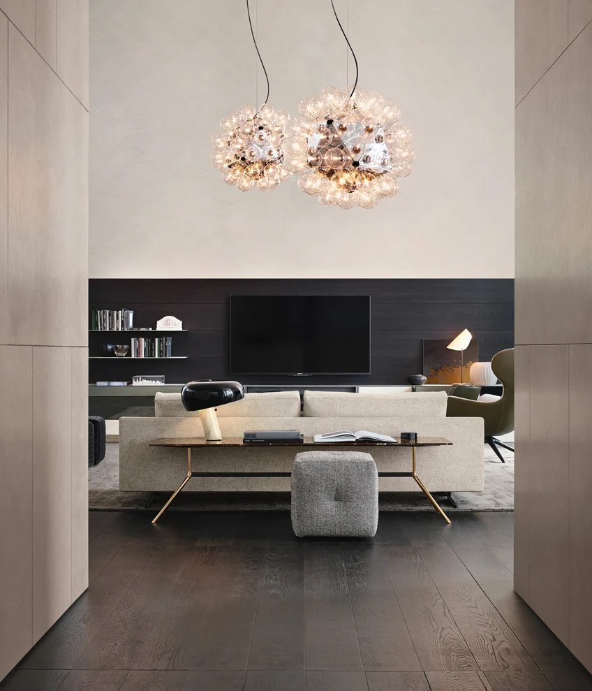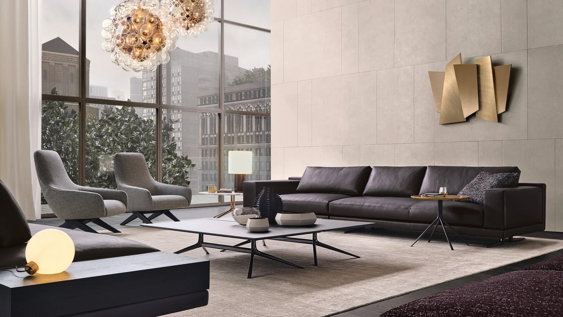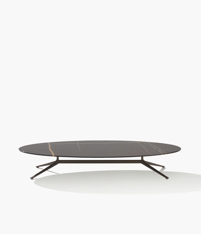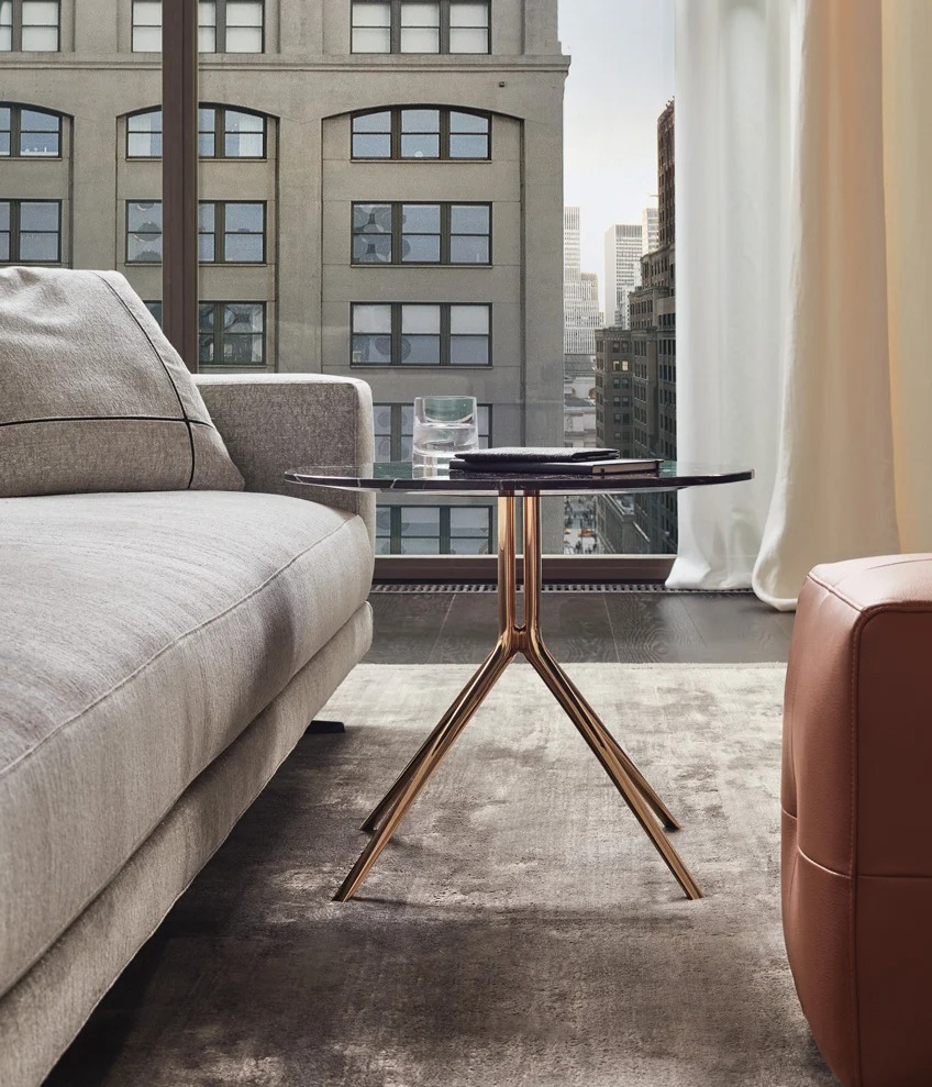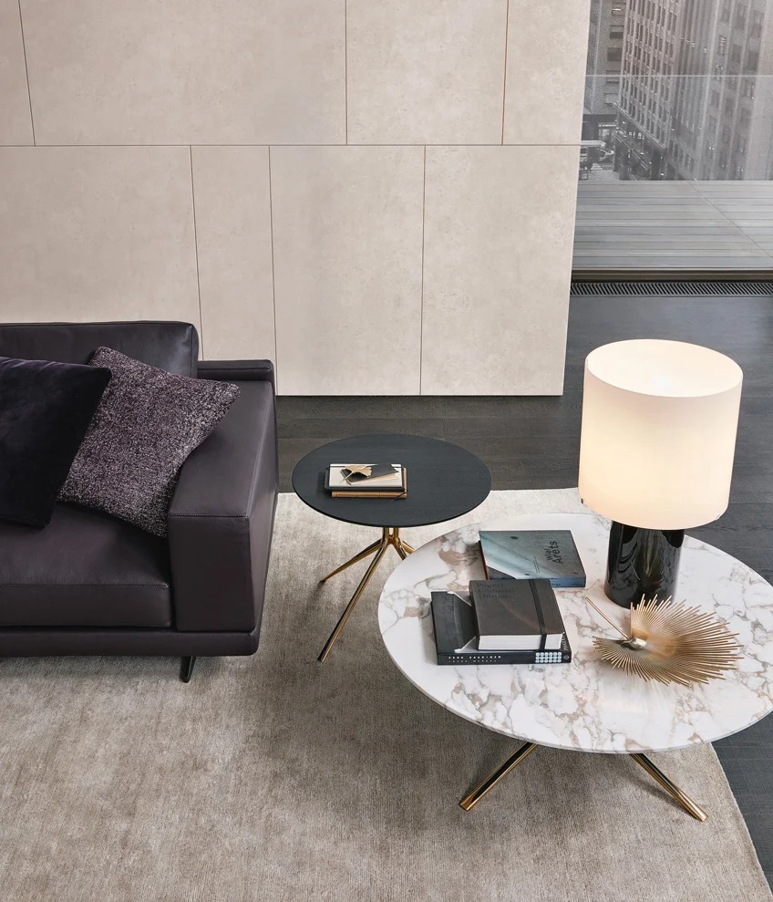 该系列具有优雅和轻盈的形象,薄的顶部由木材,大理石,或光滑和垫子漆完成。两种高度和不同形状的桌子便于多种元素的组合,这些桌子很容易包括在生活区,并与同名沙发系统完美结合。