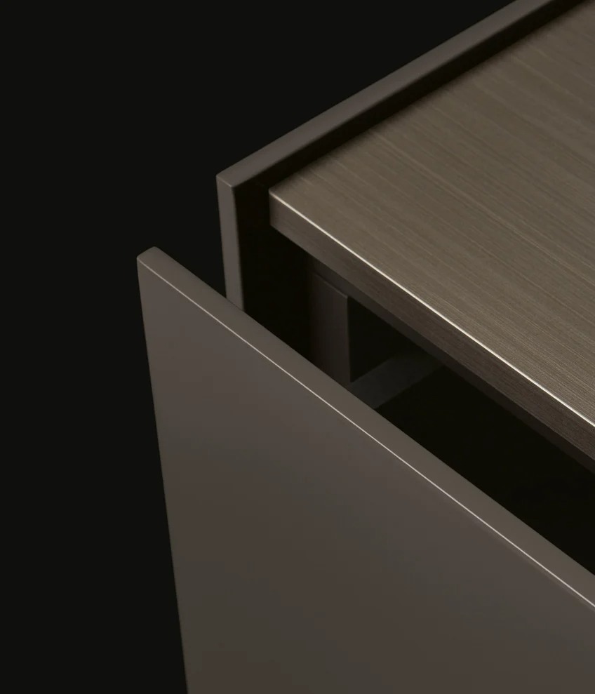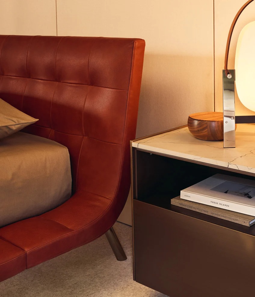与Chloe床配套的是一系列配饰,灵感来自床头板向内折叠的特殊设计。在Chloe的床头柜和抽屉柜中,覆盖着皮革的金属支撑面被转变成一个标志性的细节,从而征服了轻盈和个性。