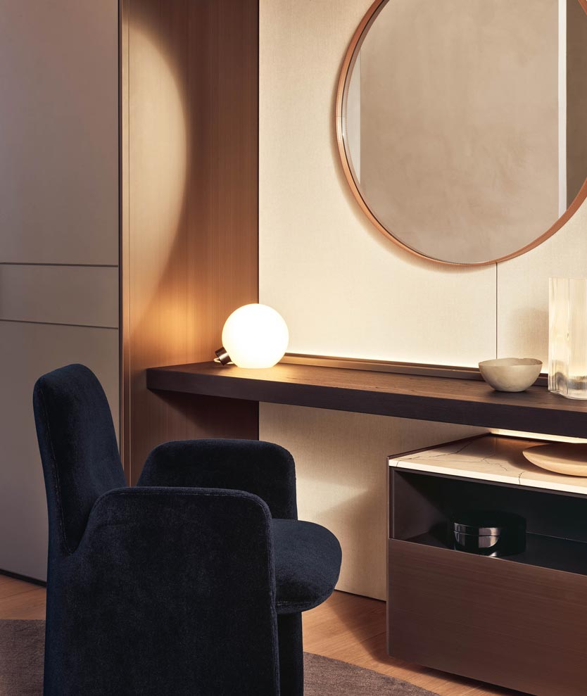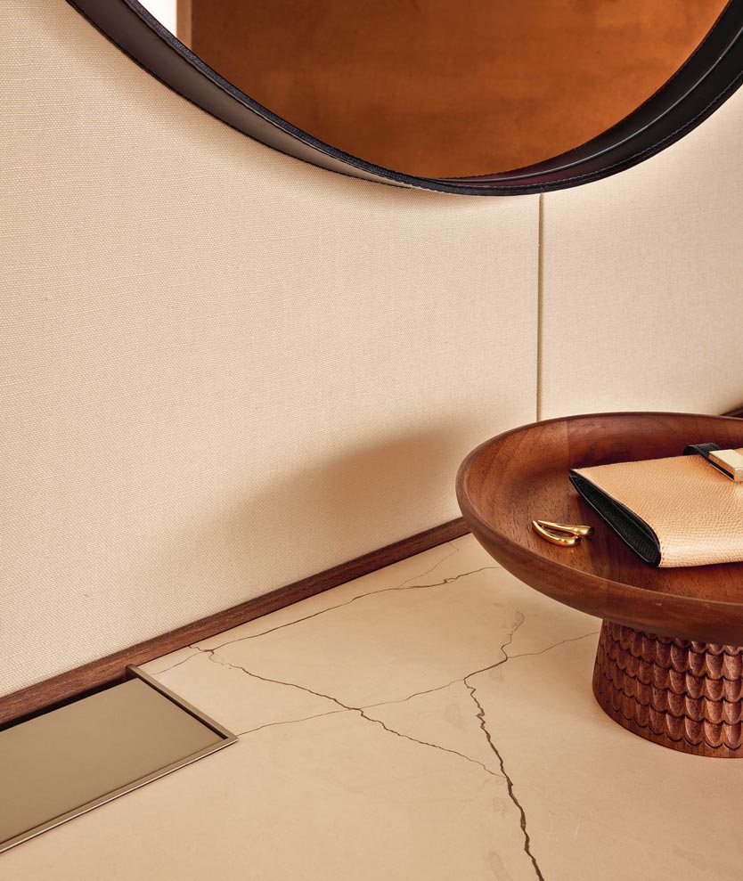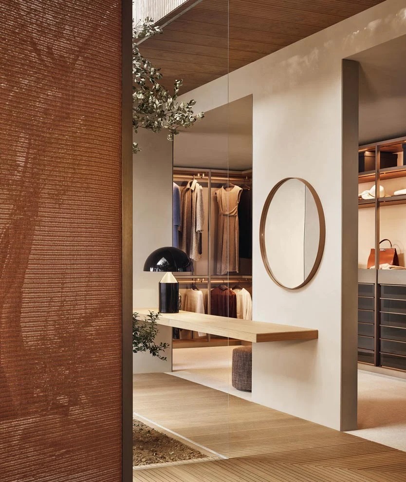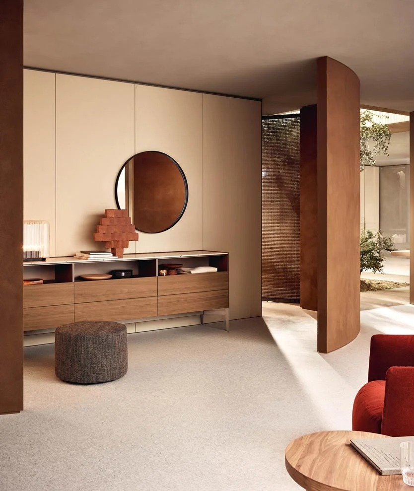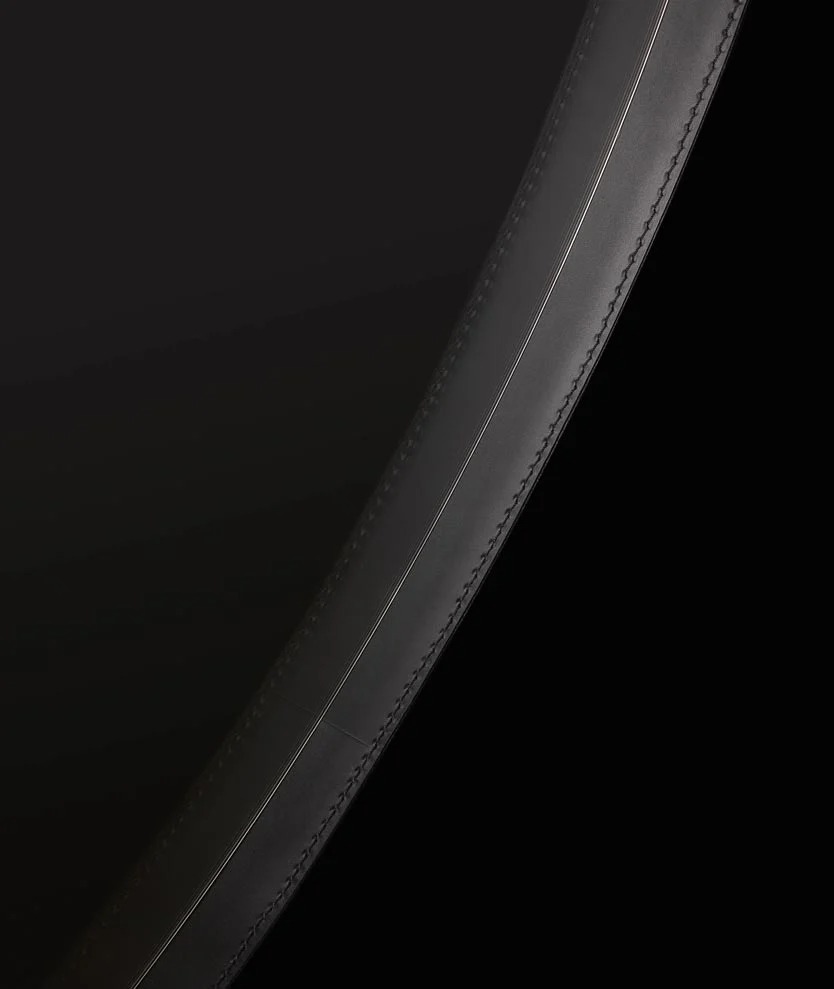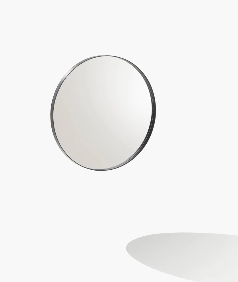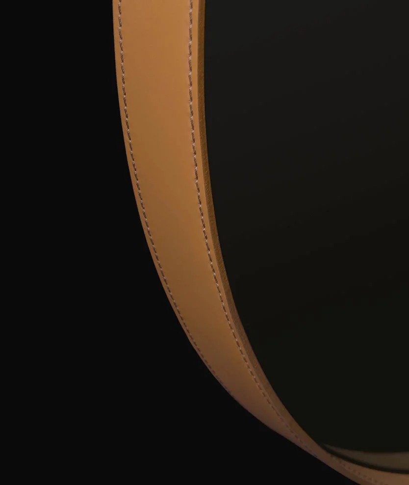 圆形是一面墙上的镜子,圆形的几何完美与皮革框架的优雅相结合,使任何房间都变得简单。