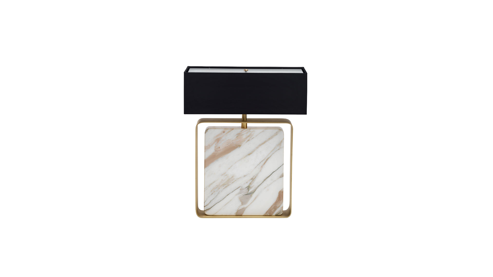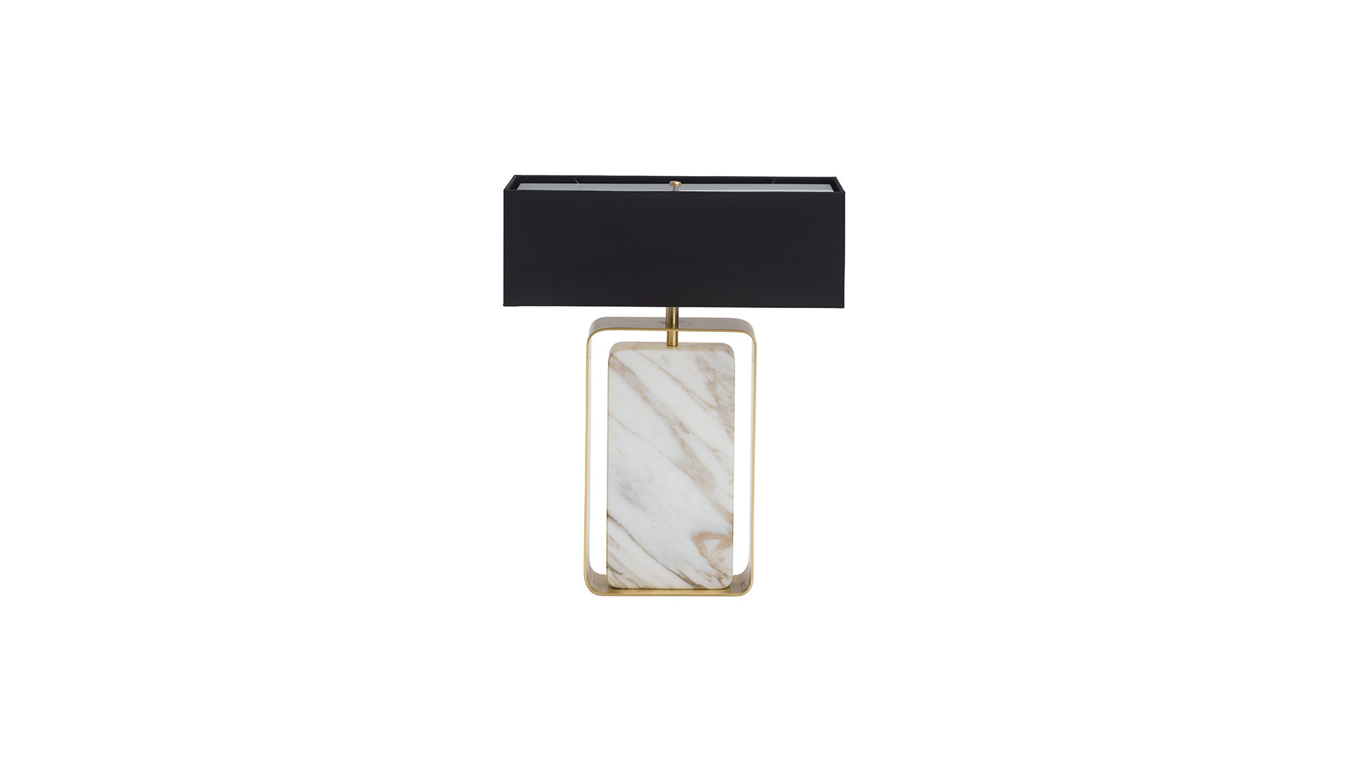缎面黄铜结构,金色 Calacatta 大理石细节,安排为 nr。2 个 E27 灯泡。黑色缎面灯罩。
