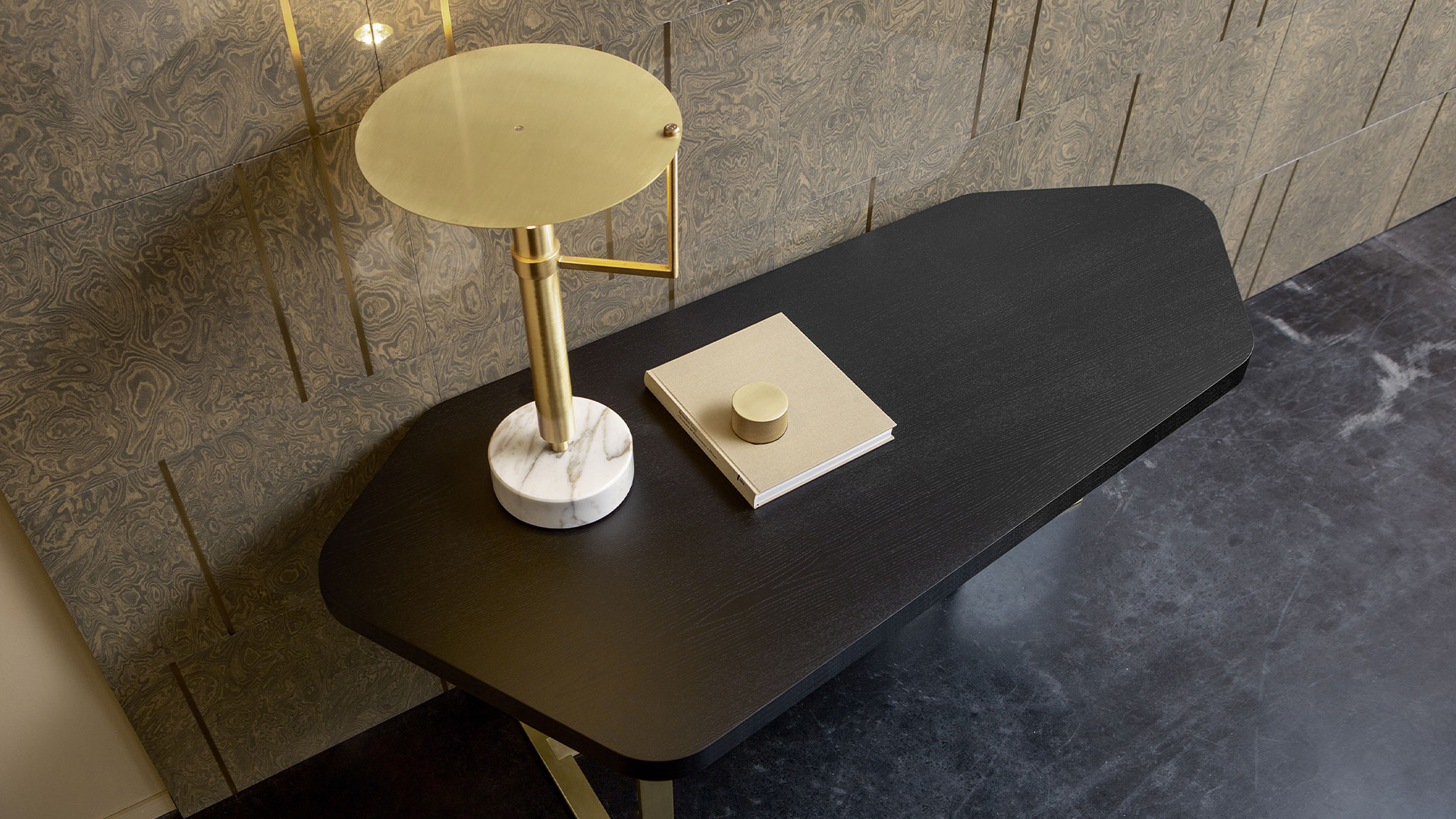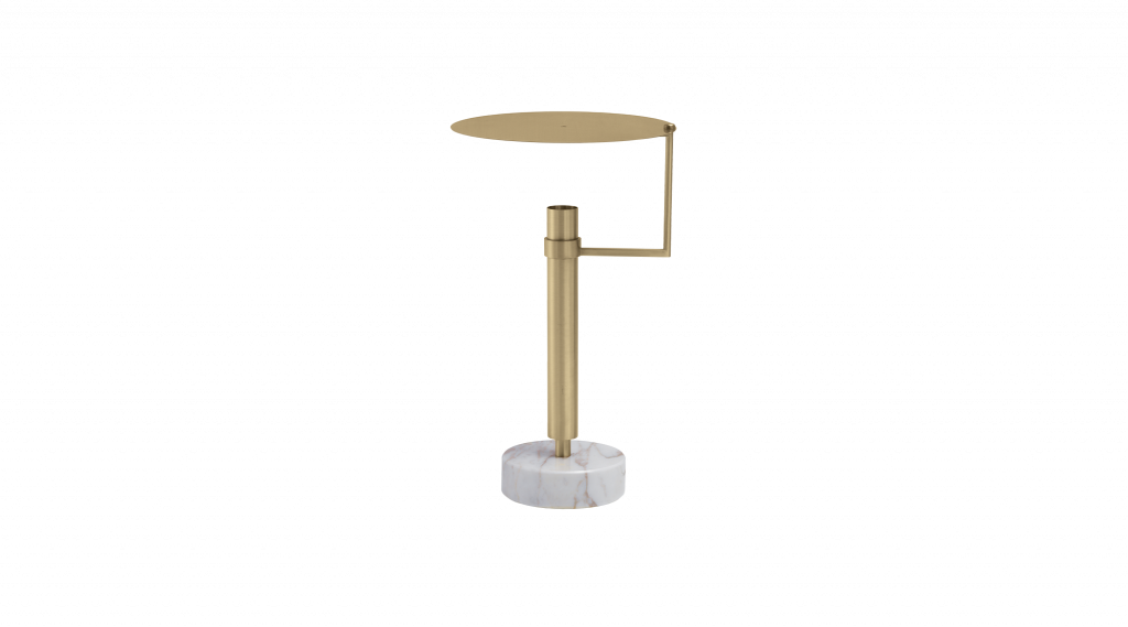 缎面黄铜结构,带有金色 Calacatta 大理石细节和集成 LED。