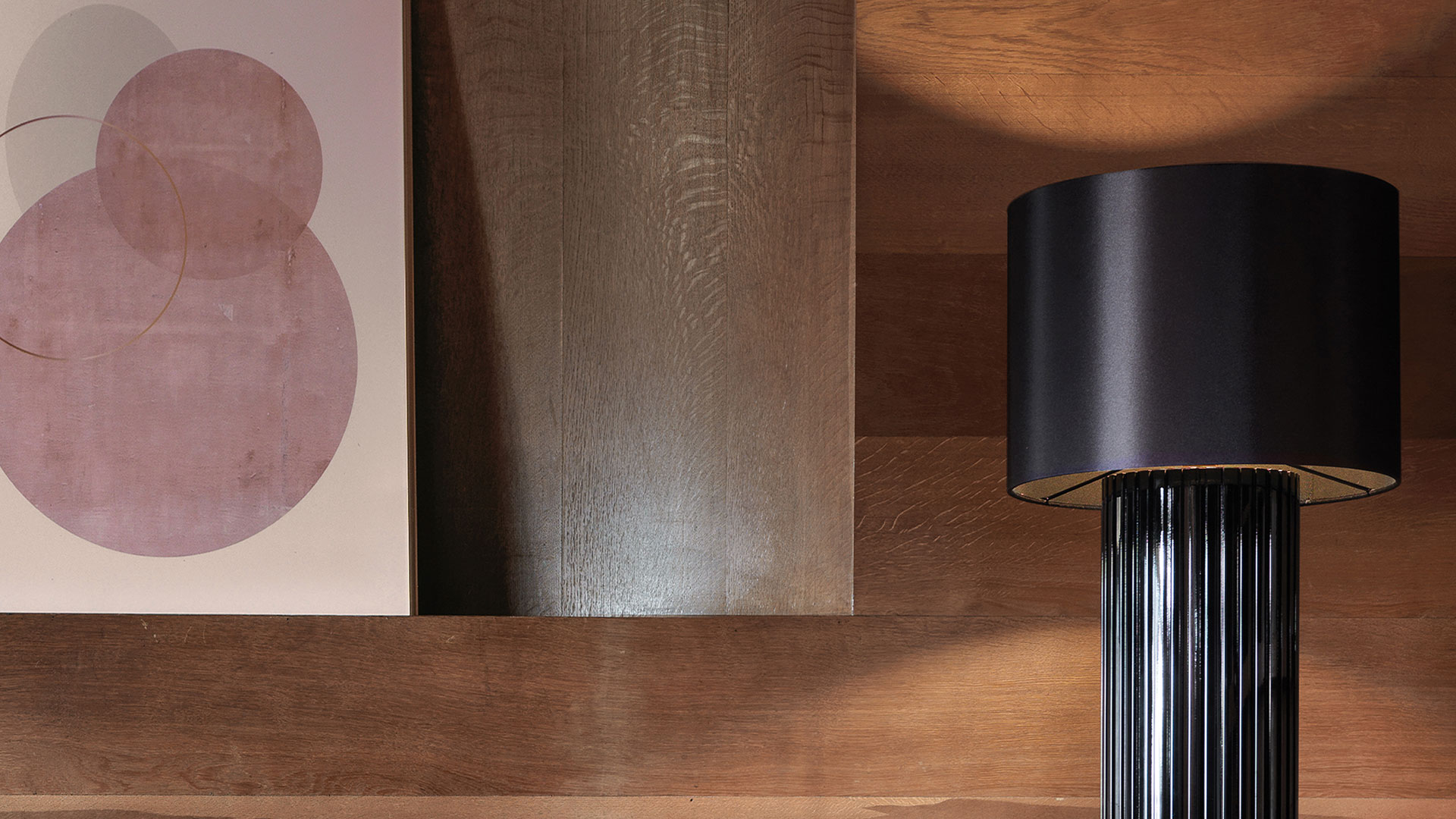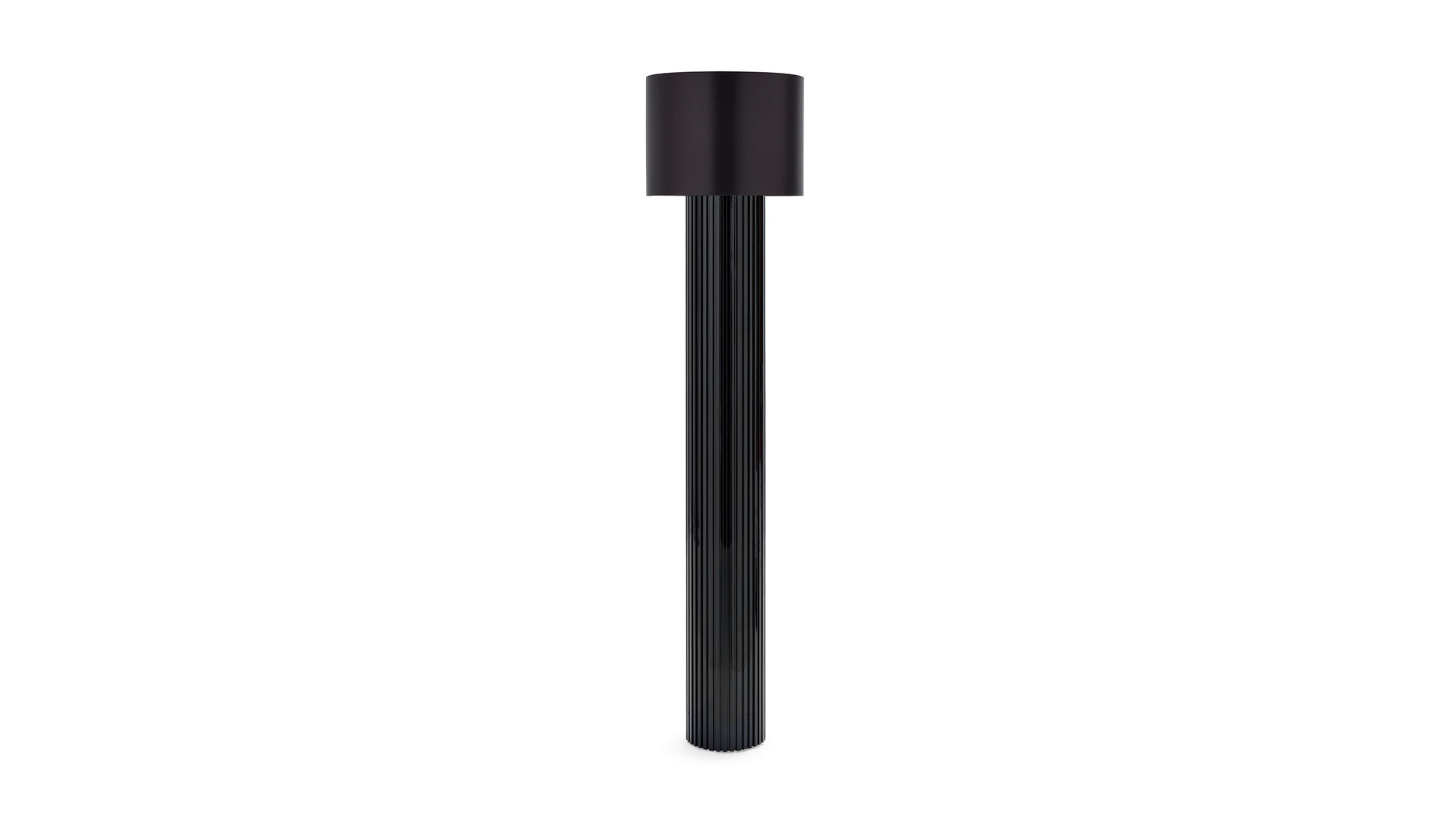 茎采用光面漆木,经过 Canneté 处理。为 E27 灯泡准备。黑色缎面灯罩。