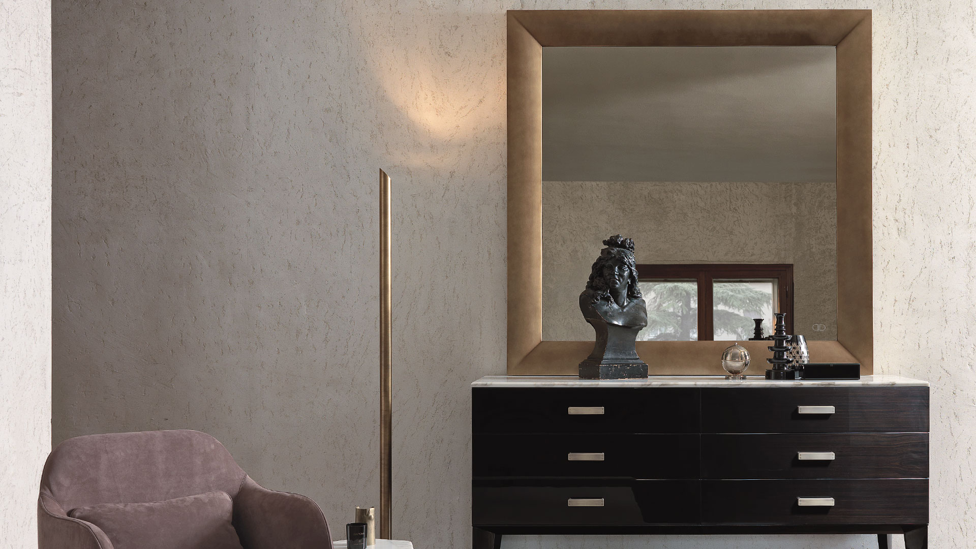实心胡桃木框架,拉丝抛光黄铜饰面。天然镜子。