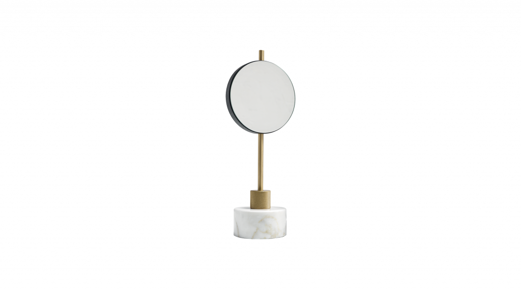 金色 Calacatta 大理石底座,黄铜饰面钢框架,应用旋转镜