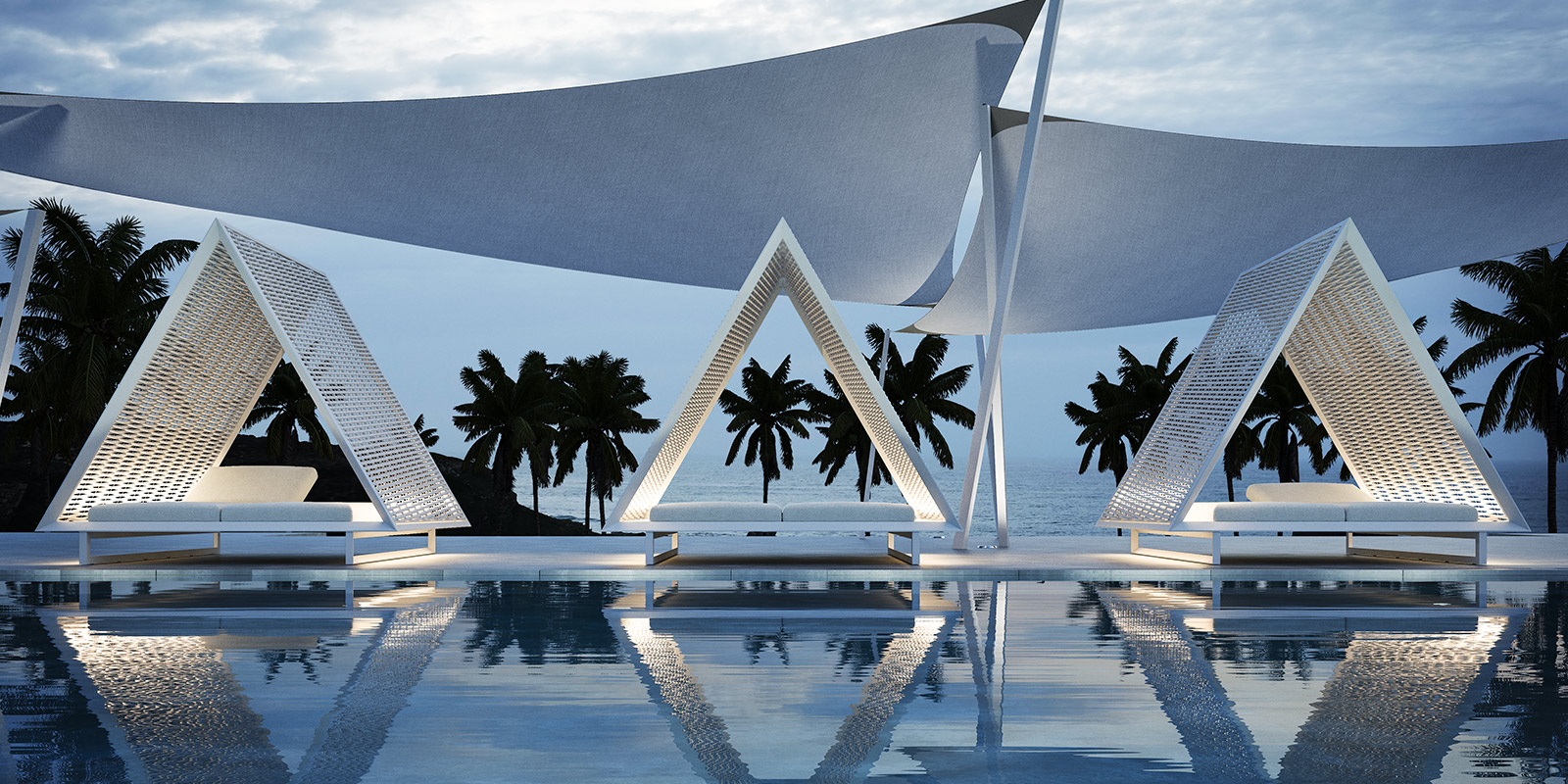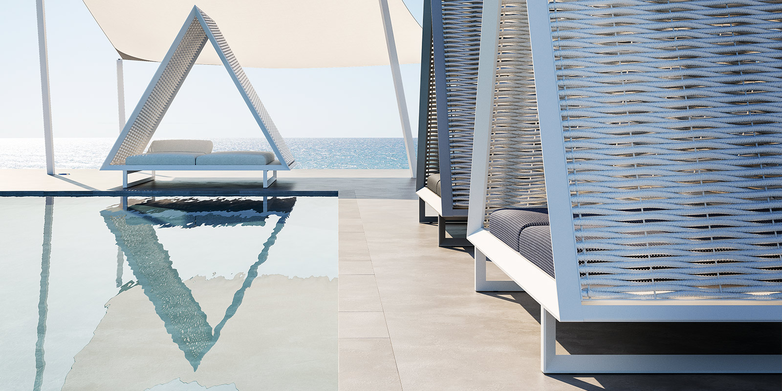 由Ramon Esteve为Vondom设计,Vineyard诞生于避难所的想法。它的山墙屋顶让人想起传统建筑;这件作品由铝结构和双卧式床垫组成,可确保舒适和多功能的沙发床。它纯粹而简单的线条和金字塔形的形状使其成为休息,交谈,冥想,睡眠或只是放松的理想环境。