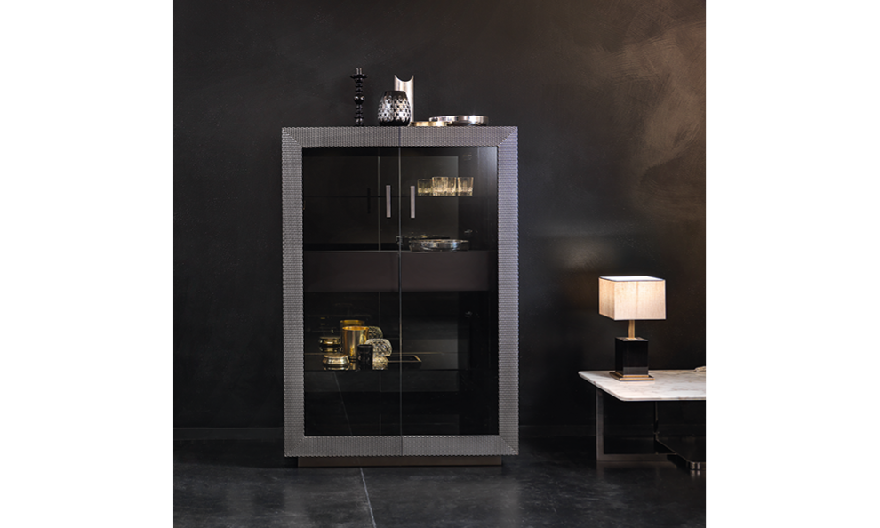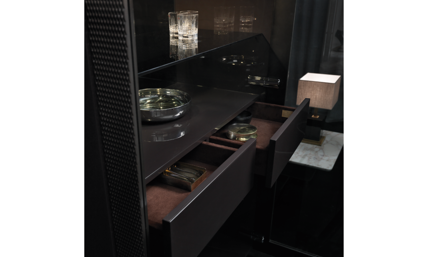胶合板结构,深色胡桃木盖,拉丝光泽饰面。玻璃门,带有波浪形纬线绗缝的轮廓,采用拉丝光泽古色金箔或拉丝光泽古色银箔。内部抽屉单元采用织物软垫,带有柔软的金属导轨、LED 聚光灯和自然镜背。
