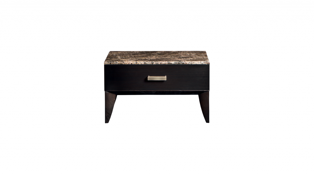 胶合板结构,深色胡桃木盖,拉丝光泽饰面。抽屉采用织物软垫,带有柔软的金属导轨。抛光黄铜和大理石顶部手柄。