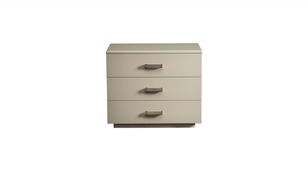 胶合板结构和拉丝光泽漆木顶部。抽屉采用织物软垫,带有柔软的金属导轨。抛光黄铜底座和把手。