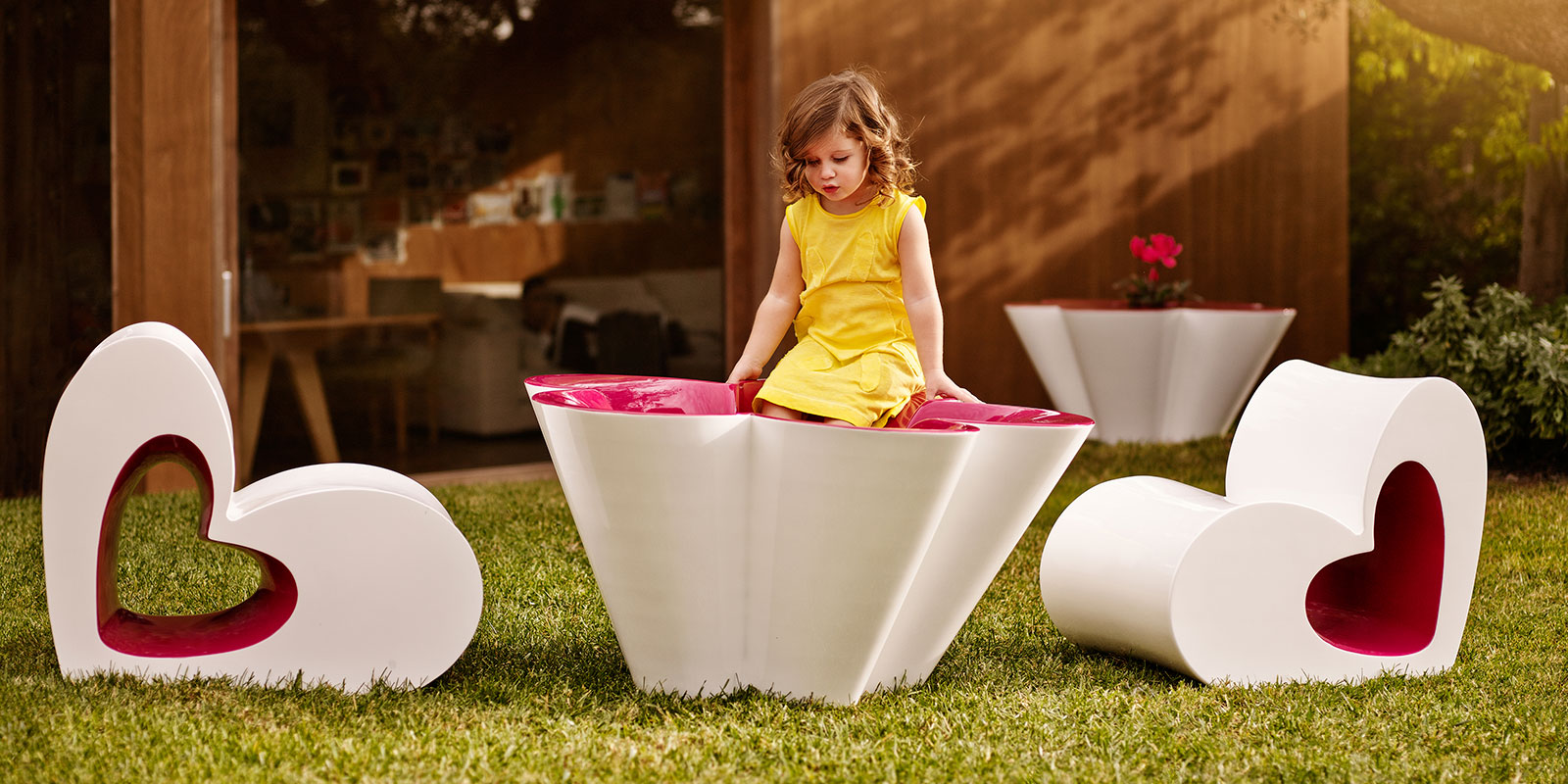 AGATHA, by AGATHA RUIZ DE LA PRADA 为 VONDOM 的大门带来青春、纯真和自发性,这是它的第一个 Kids 系列。设计师的特色图标通过其简单,甜美和精致的形状立即辨别出来。这是一个有趣,富有创意和乐观的系列,以孩子般的术语列出:鲜花,心......这个儿童家具系列由三个基本部分组成:花盆,桌子和迷你椅。这张桌子和花盆由一朵花瓣组成,并配有心形凳子。它是高度耐用的材料,允许外部使用,使其可以在户外或作为游乐场区域享受它。一个梦幻般的花园,孩子们的活力,想象力和独创性将变得具有感染力,这要归功于这些引人注目的设计师物品。