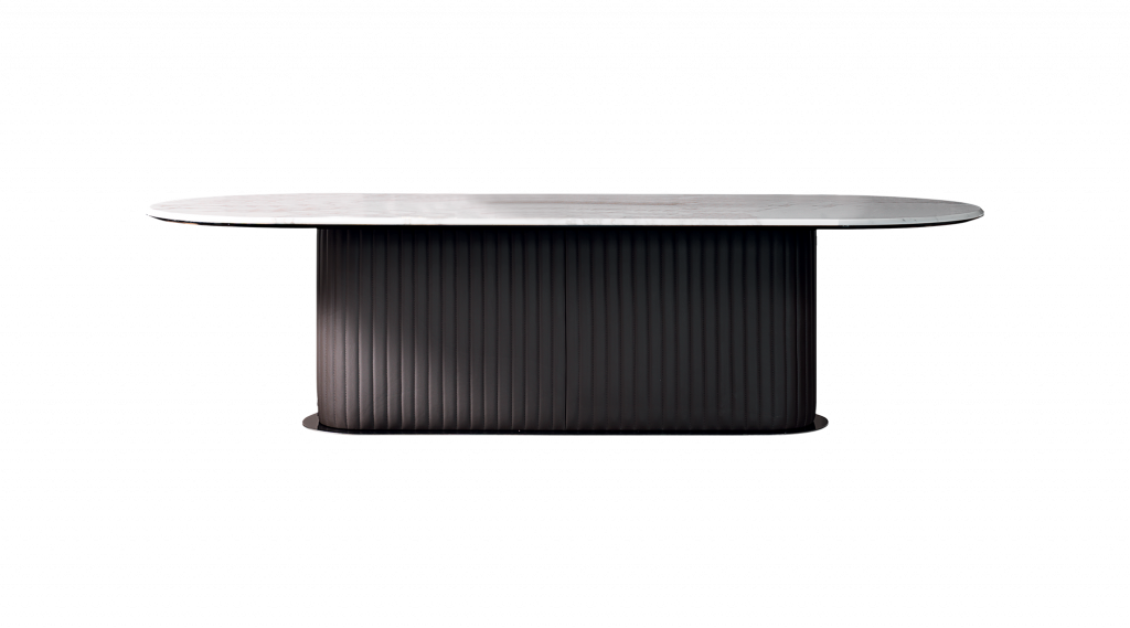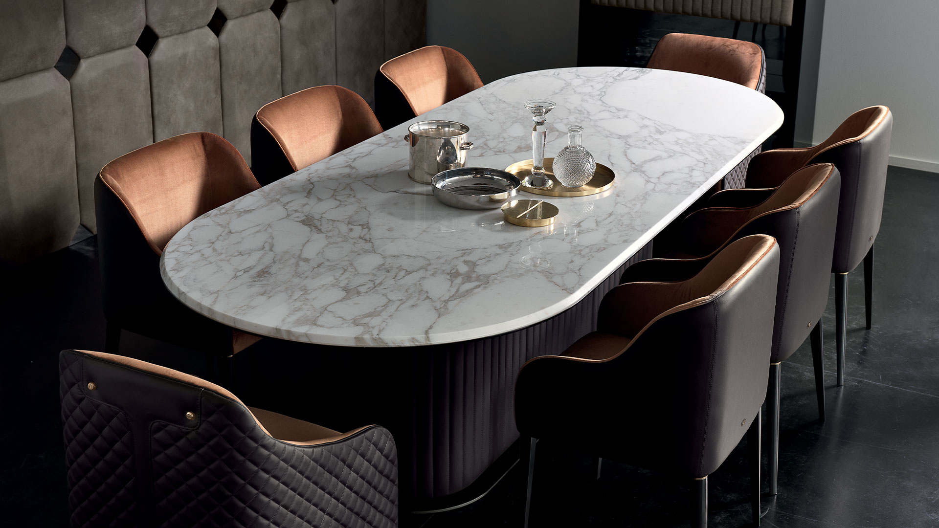 曲木结构,采用 cannetté 绗缝,钛金属饰面金属底座。大理石台面。