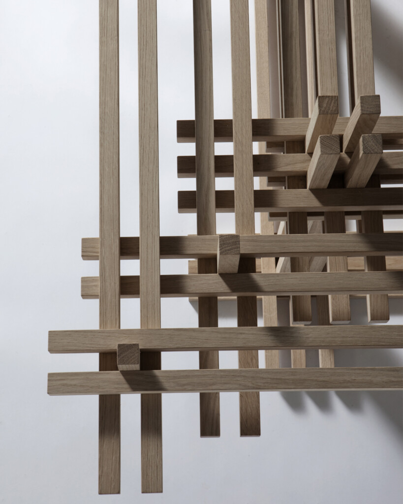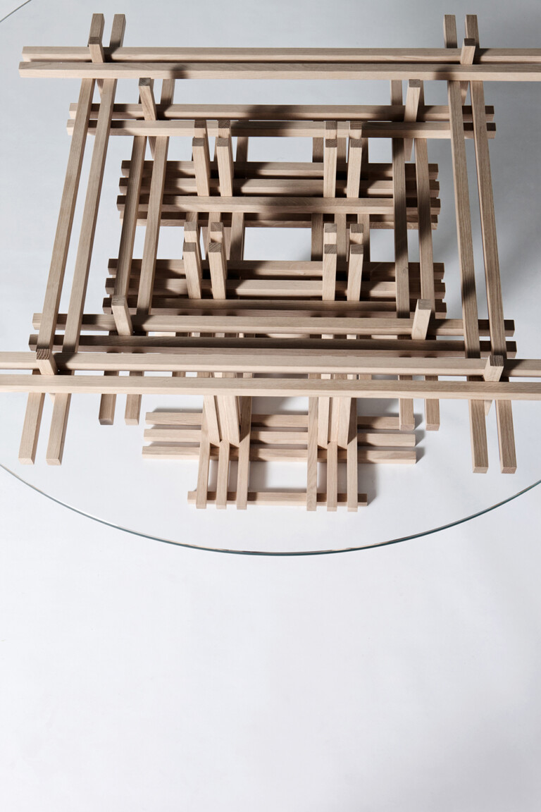 用纯橡木条制成的桌子,天然或染色成该系列的颜色。列表的交叉游戏灵感来自日本古代建筑。