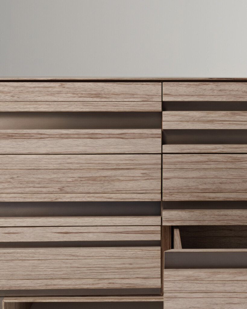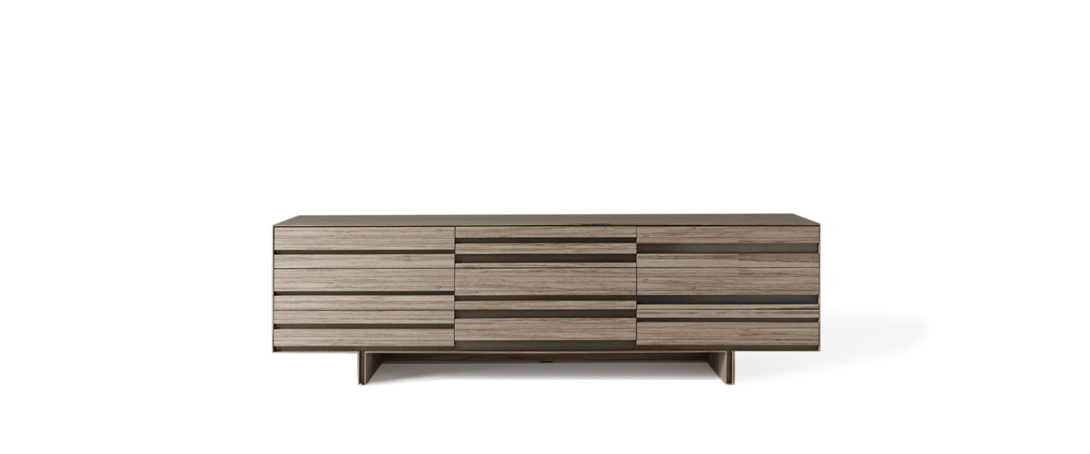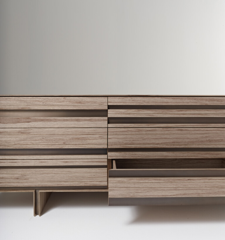 木材和黄铜的交替为休伯特带来了现代而精致的形象。带抽屉或门的容器,它看起来像一个轻盈而珍贵的体积,具有现代特色。
