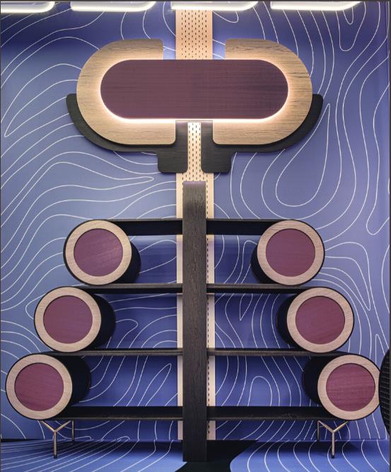 带有法国轮子的 Roue 书柜想要播放,以庆祝该公司的专长,该公司一直是弯曲木材生产工艺的领导者。 三条大丝带重叠,形成了一种现代金字塔,由一个大的中央带稳定下来,由六个圆形容器丰富,除了作为一个功能丰富的,作为一个装饰性和代表性的元素。
