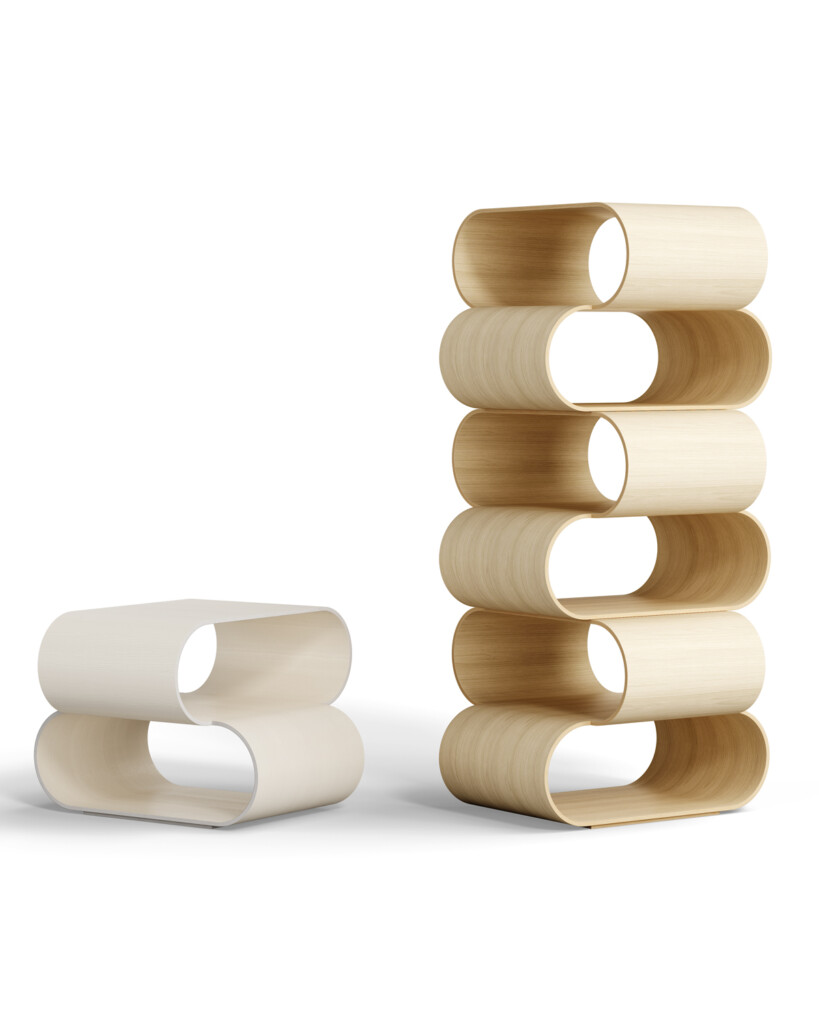 可堆叠的支撑元件采用弯曲胶合板。可以组合单独的作品供书柜使用。