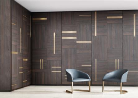 Agorà boiserie 是一种旨在以优雅、精致和实用的方式增强墙壁的系统。 对比色和交叉木纹的几何效果创造了面板的装饰,可以用天然或抛光黄铜制成的精致嵌件丰富它。 与其他 Emmemobili boiserie 提案一样,该提案也可以根据客户的特定需求进行定制。随附的技术图表提供了一些使用方法的示例。