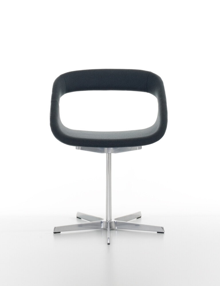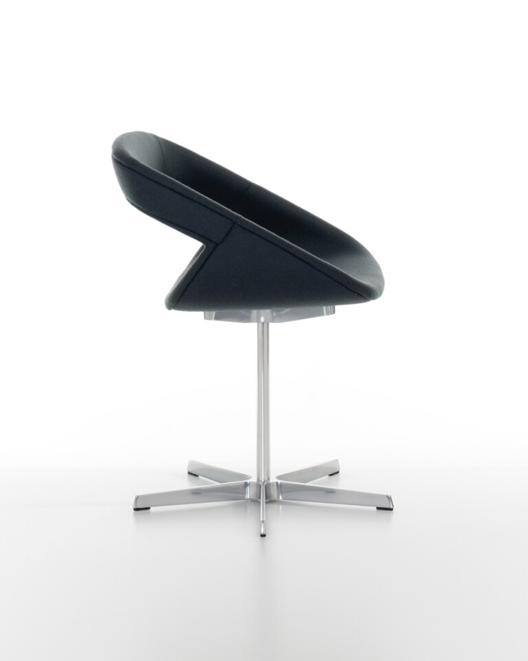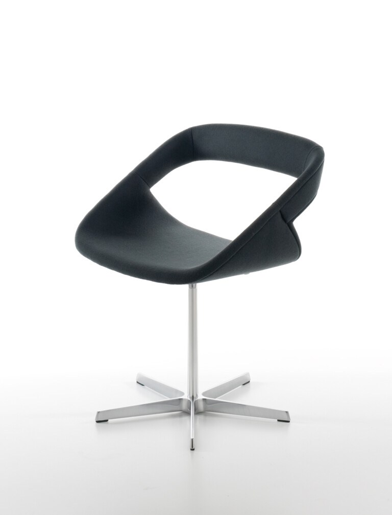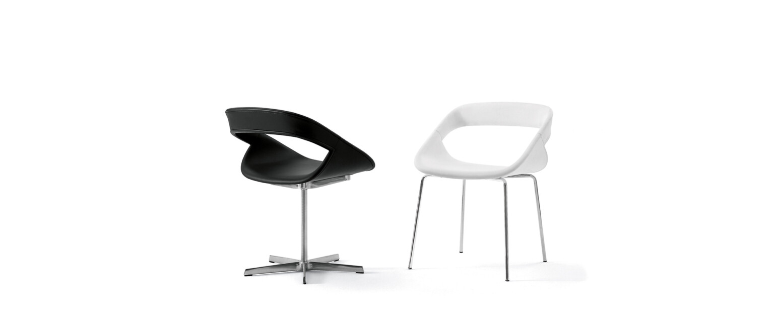 弯曲胶合板椅子,覆盖木材,哑光漆面或软垫。5辐旋转结构,采用铸铝制成,或固定4条腿,采用镀铬金属或实木制成。