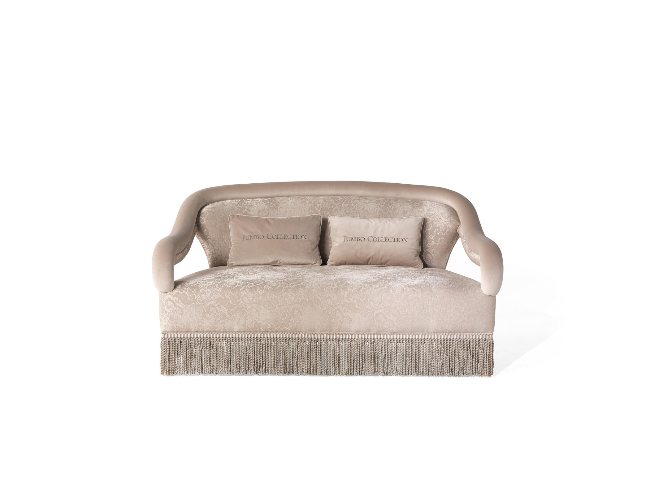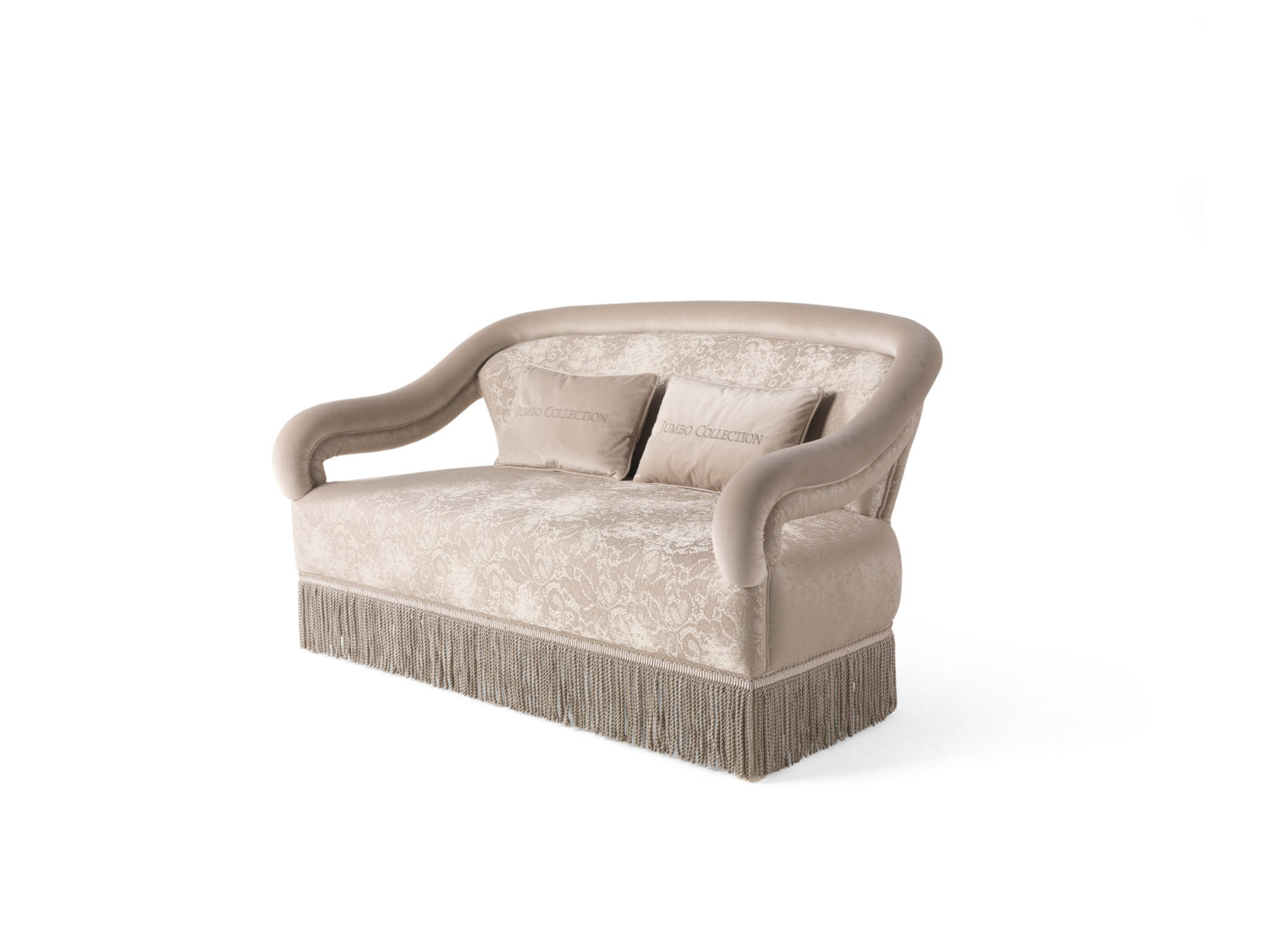 2座沙发,采用山毛榉木结构。泡沫填充。织物内饰,带装饰流苏。N°2枕头,包括30X50厘米。
