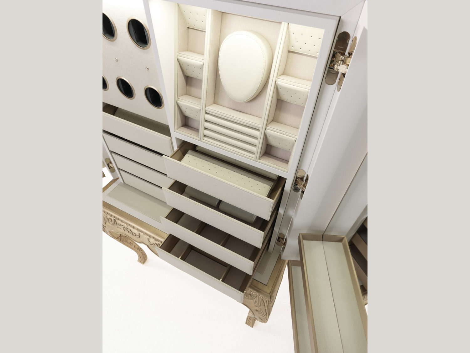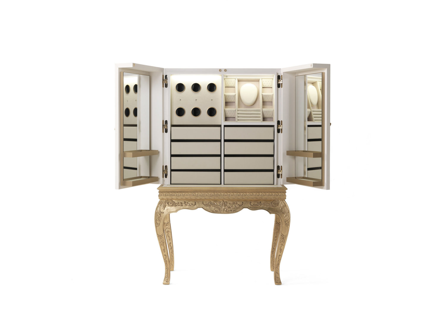 珠宝柜,木质底座,手工雕刻的腿和装饰框架,带有古色古香的金色饰面。白色漆木结构,金箔激光雕刻蕾丝装饰。两扇门。内部隔间配有抽屉,三个电动时钟转子,三个时钟隔间和配件隔间,内部装潢采用皮革和超细纤维制成。