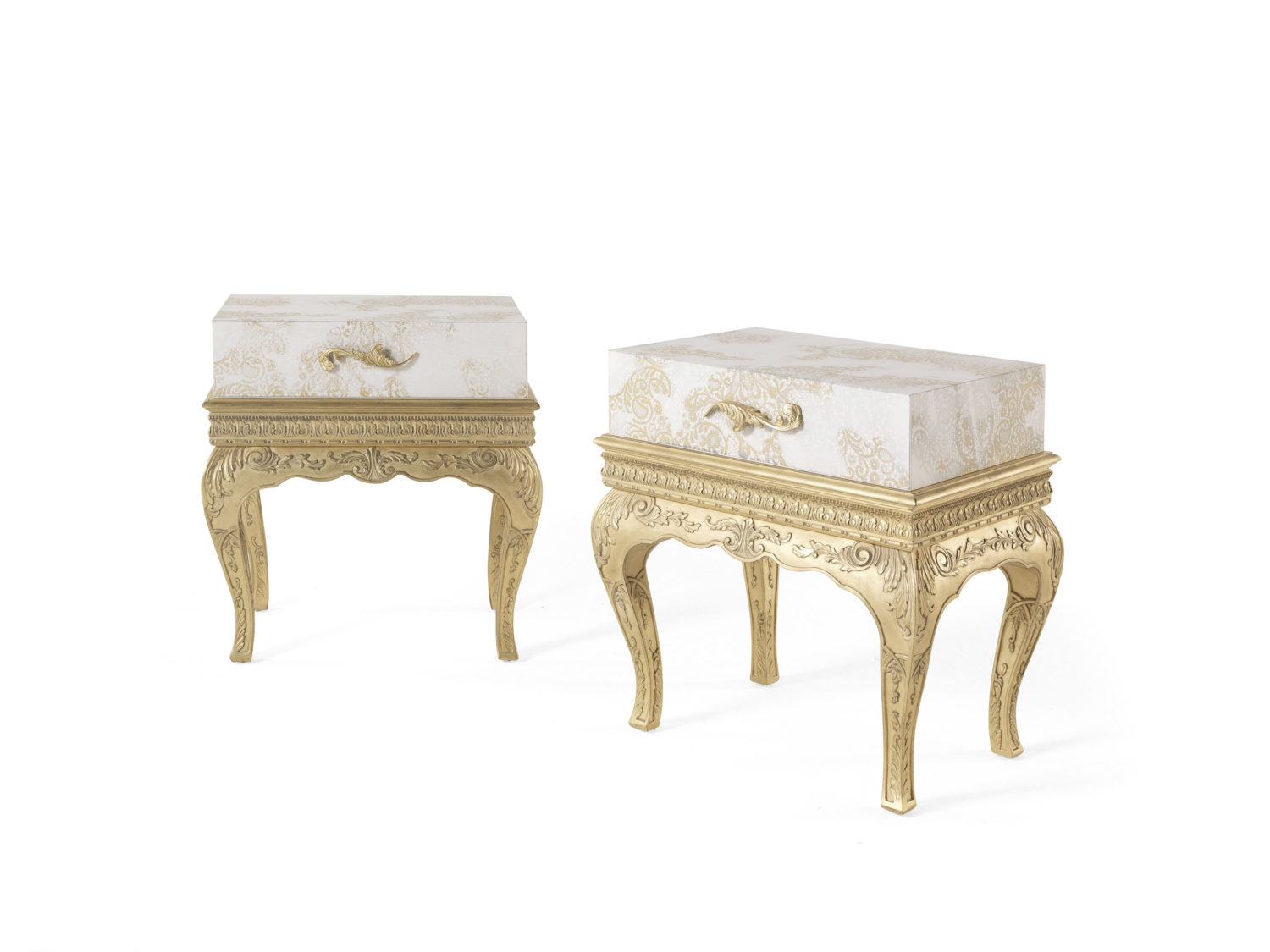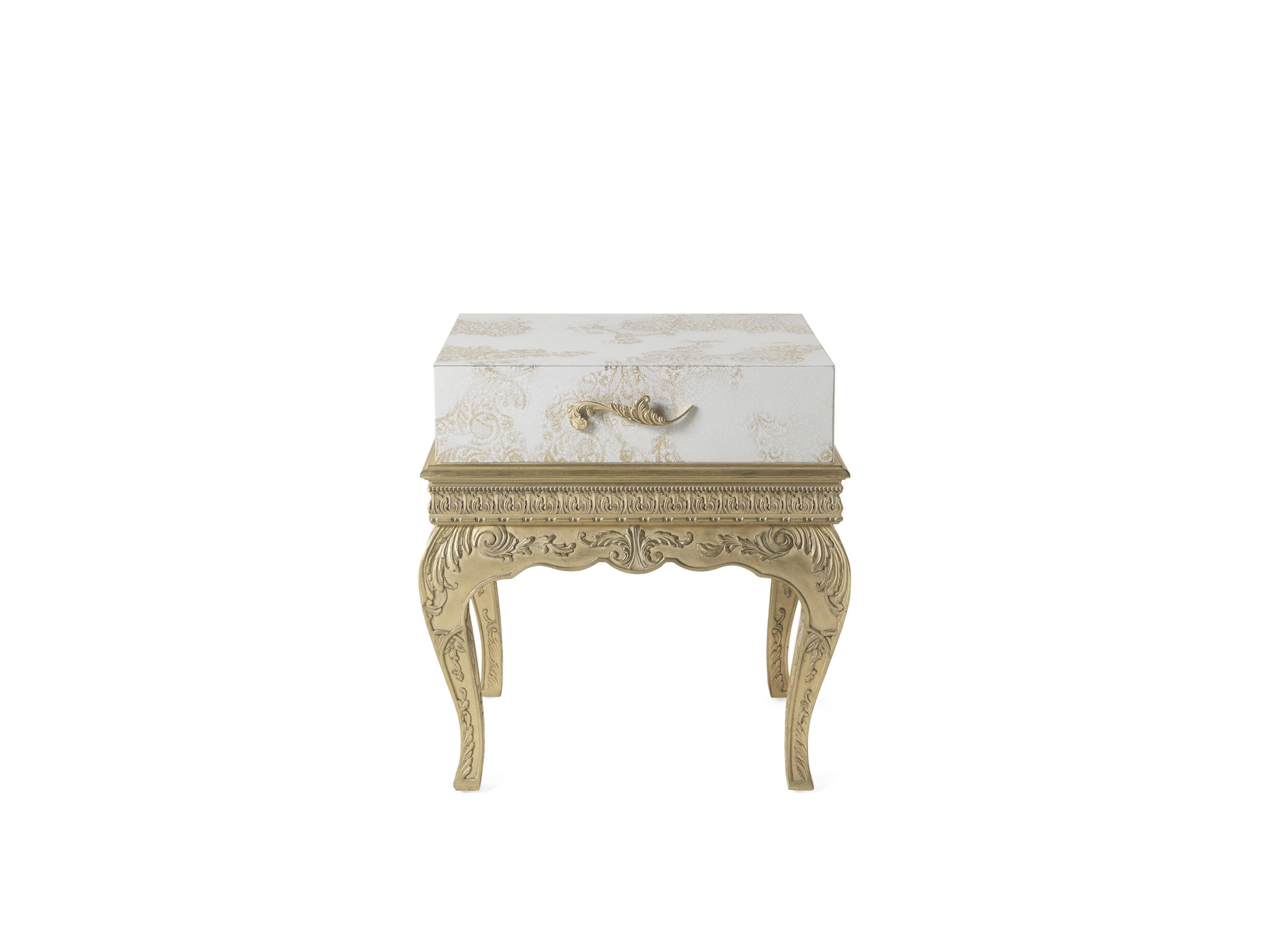 床头柜,木质底座,手工雕刻的腿和装饰框架,古色古香的金色饰面。上半身采用漆木制成,饰有金箔激光雕刻蕾丝装饰。抽屉,内部内饰采用超细纤维制成。