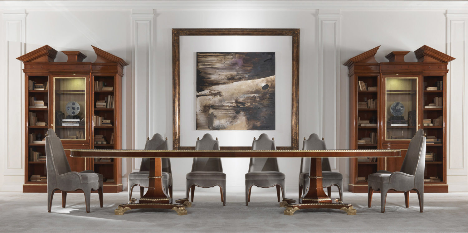 餐桌采用胡桃木结构。细节与古色古香的金色饰面。顶部有天然枫木嵌件和黄铜镶嵌物。