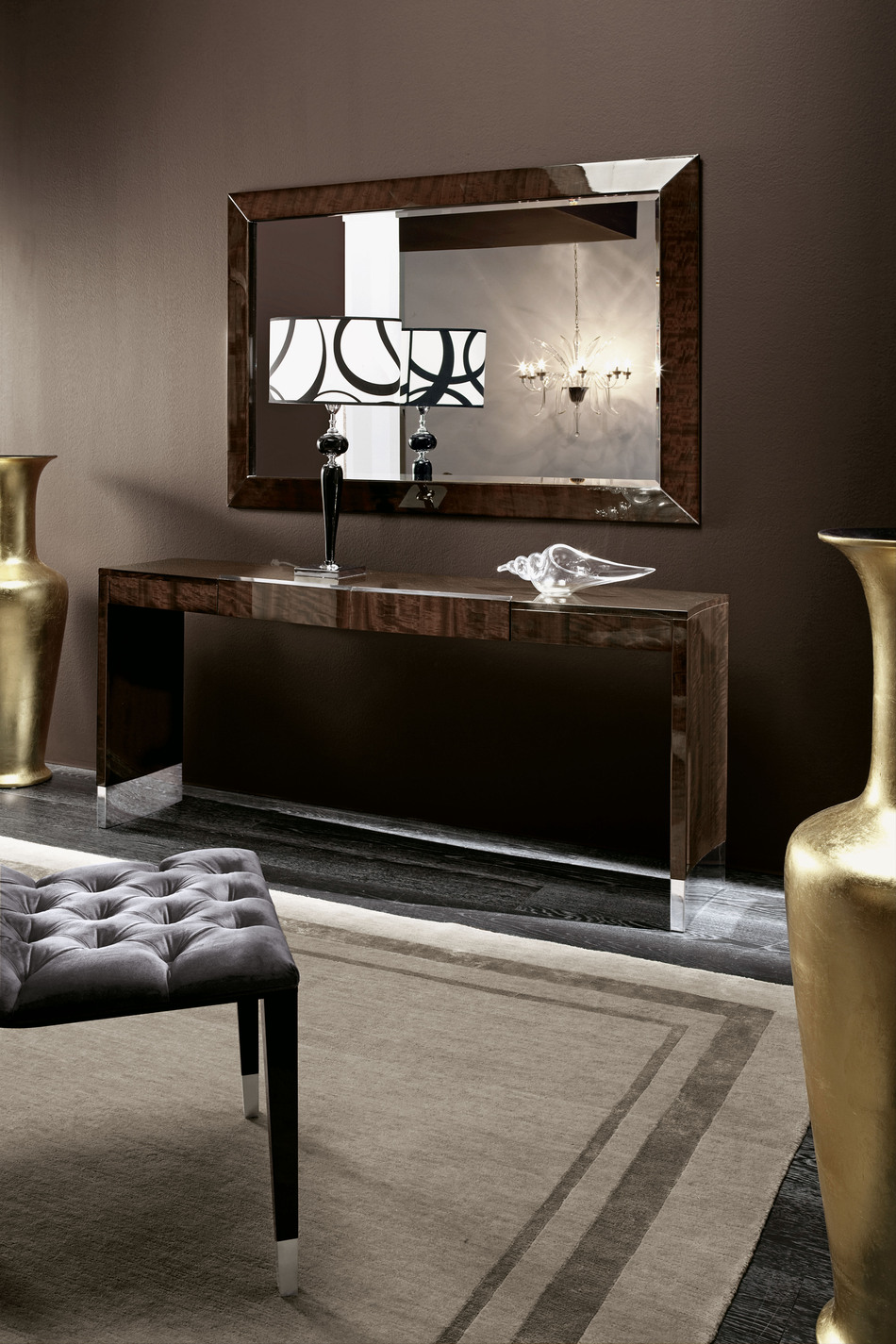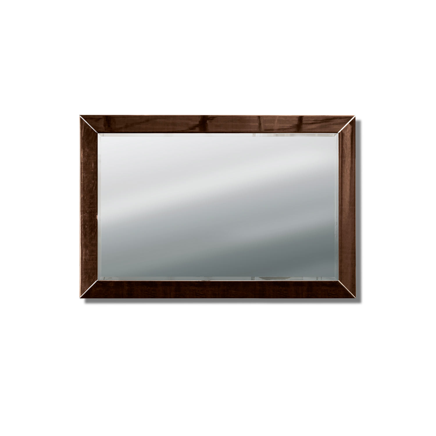 欧洲卷曲桉树贴面镜面,高光泽聚酯纤维。不锈钢镀铬的角嵌件。斜面镜。