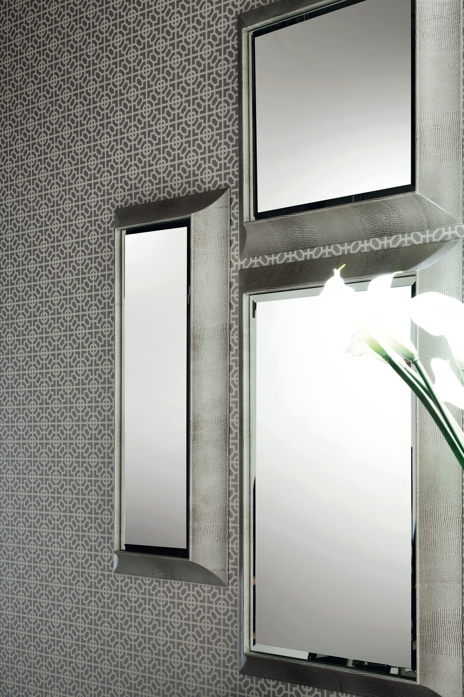 矩形镜面,银色蜥蜴纹印花皮革和不锈钢装饰,采用深灰色饰面。