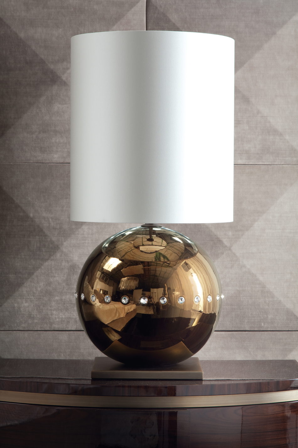 灯座,古铜色陶瓷,带施华洛世奇嵌件。白色缎面真丝色调。古铜色不锈钢底座。