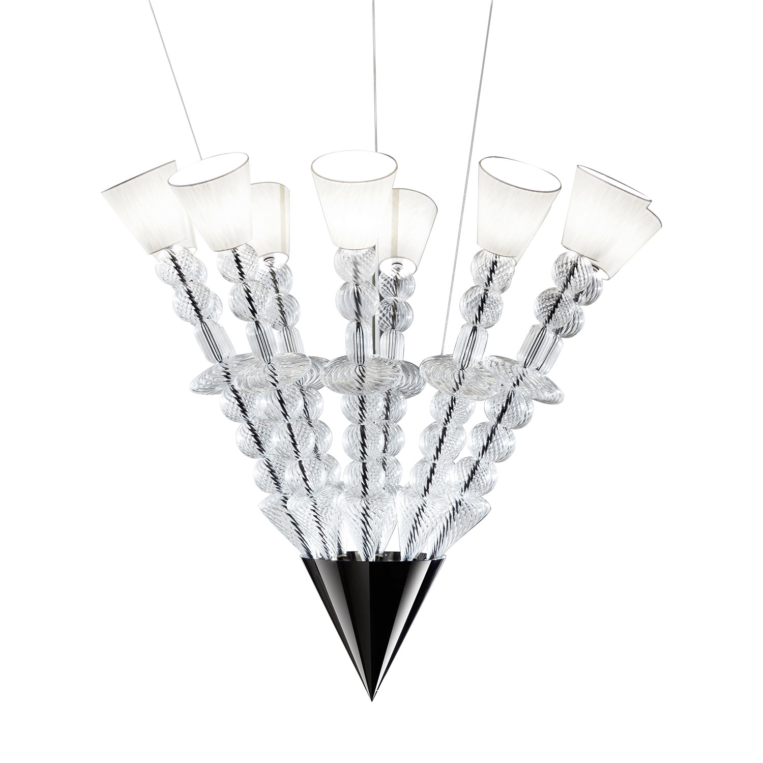 威尼斯"穆拉诺"吹制透明玻璃圆形吊灯。10个"Murano"吹制透明玻璃臂,带10个E14灯。底座采用黑色镍钢制成。