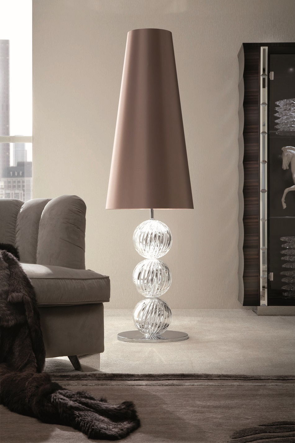 落地灯由铬不锈钢底座和威尼斯"Murano"透明吹扫玻璃组合而成。棕色缎面真丝灯罩。