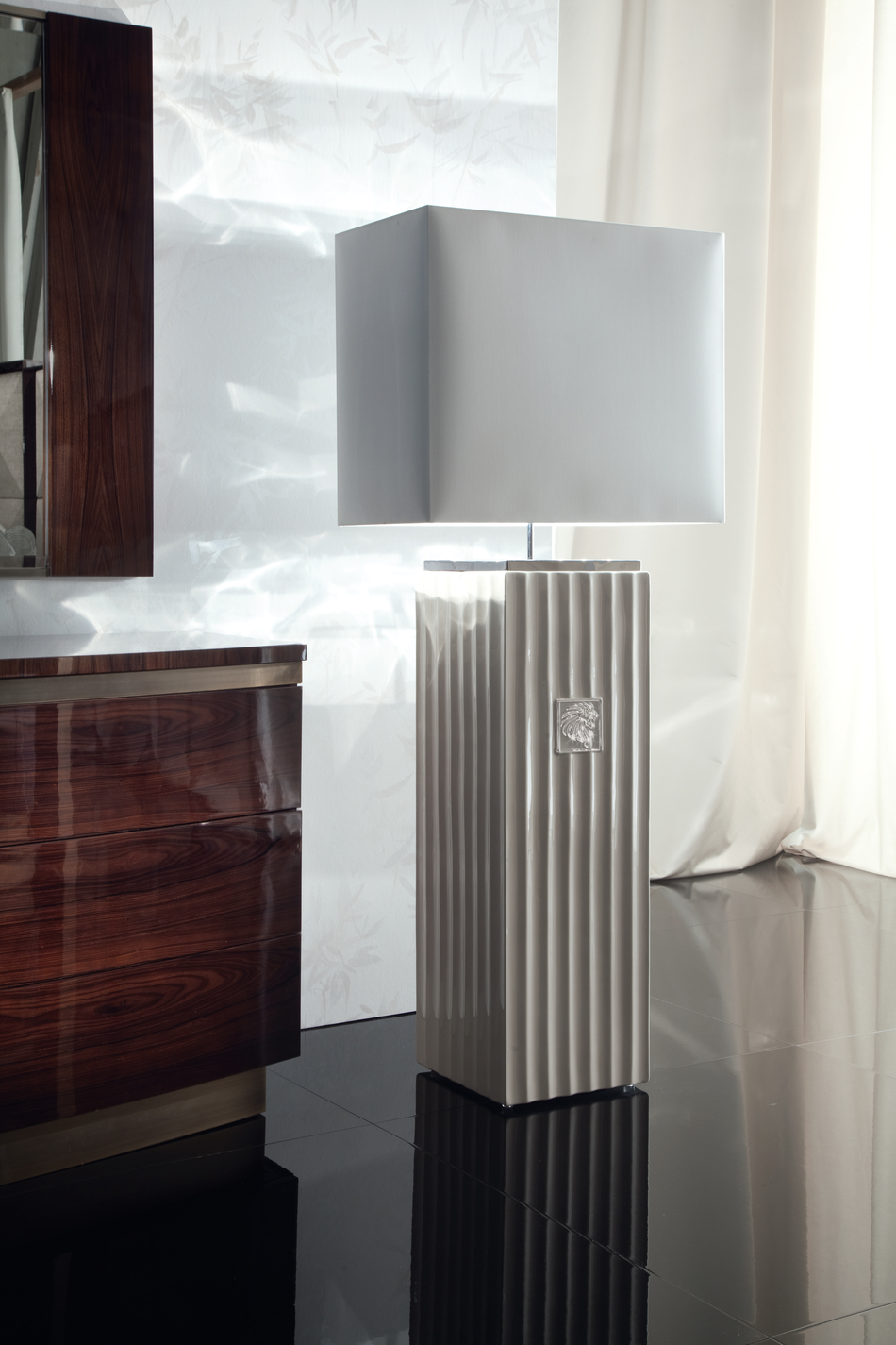 落地灯底座采用陶瓷米色,铂金饰面为"Giorgio系列"标志。镀铬不锈钢上衣和白色缎面真丝色调。
