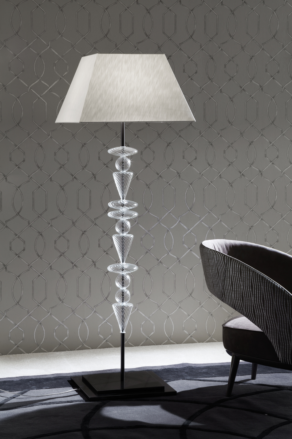 威尼斯"穆拉诺"吹制透明玻璃落地灯。底座采用黑色镍钢制成。奶油缎面真丝色调。